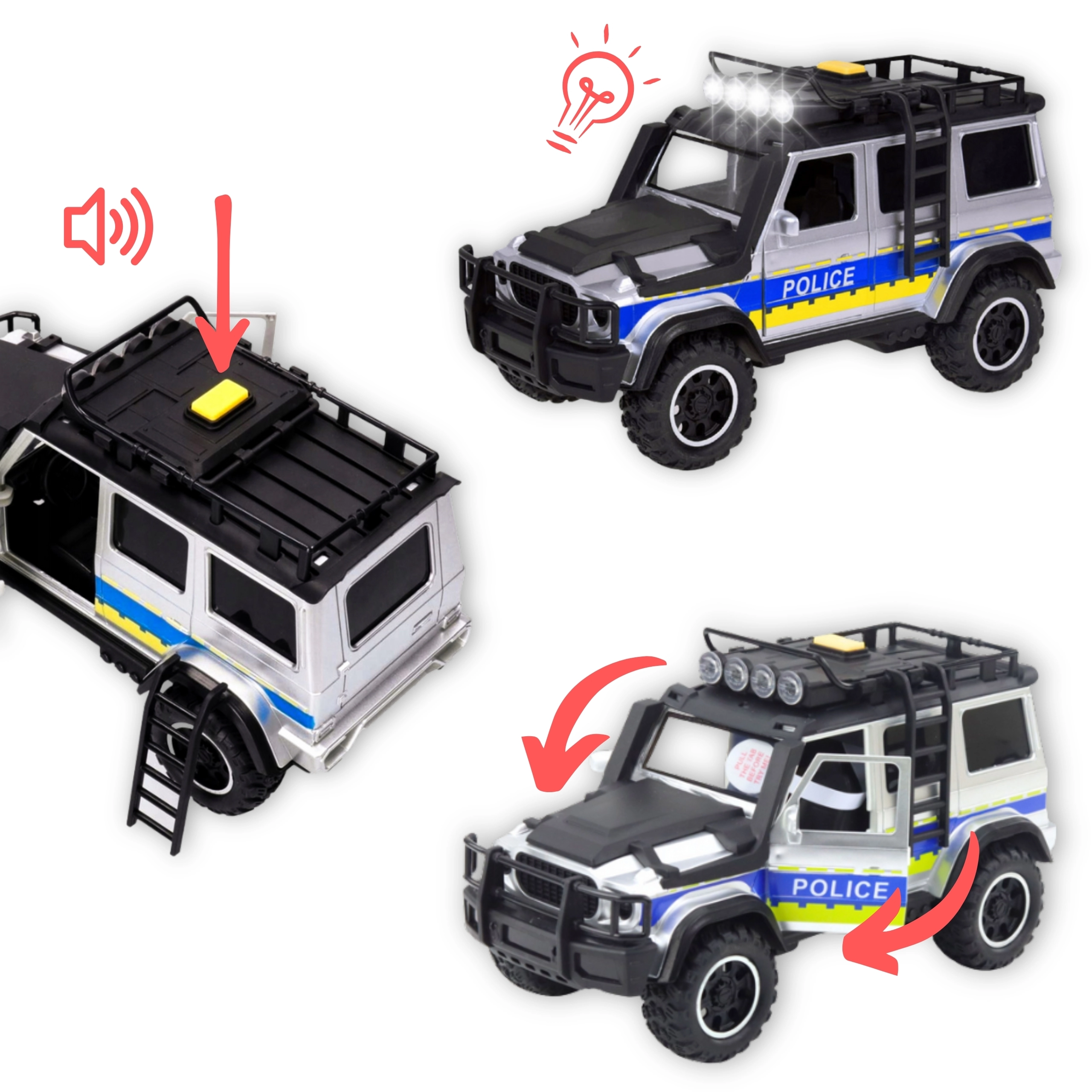 An ideal gift for children aged 3+ who love police, cars, and rescue missions. The black-and-blue aesthetic faithfully reflects service colors, and the high-quality plastic ensures long-lasting fun.