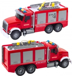 - Fire truck with water spray, water tank, flexible hose with tip, button/pump for pumping, interactive light and sound buttons