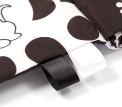 A soft sensory book for babies with high-contrast black-and-white illustrations, crinkly pages, and a removable teether. Thanks to the hanging ring, you can easily attach it to a stroller or crib. Supports visual stimulation, fine motor skill development, and provides relief during teething.