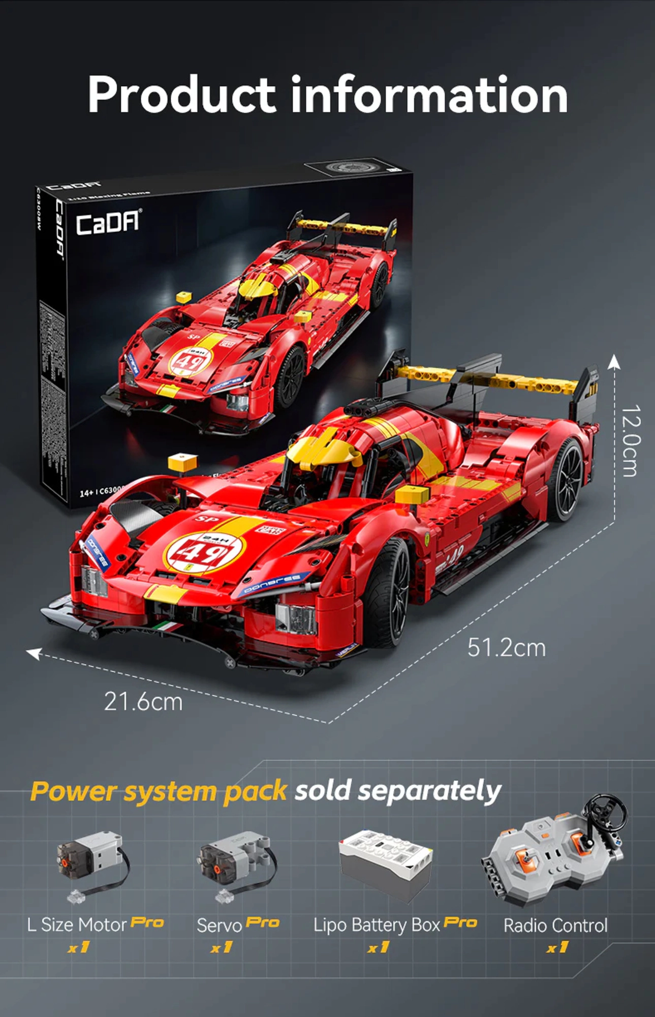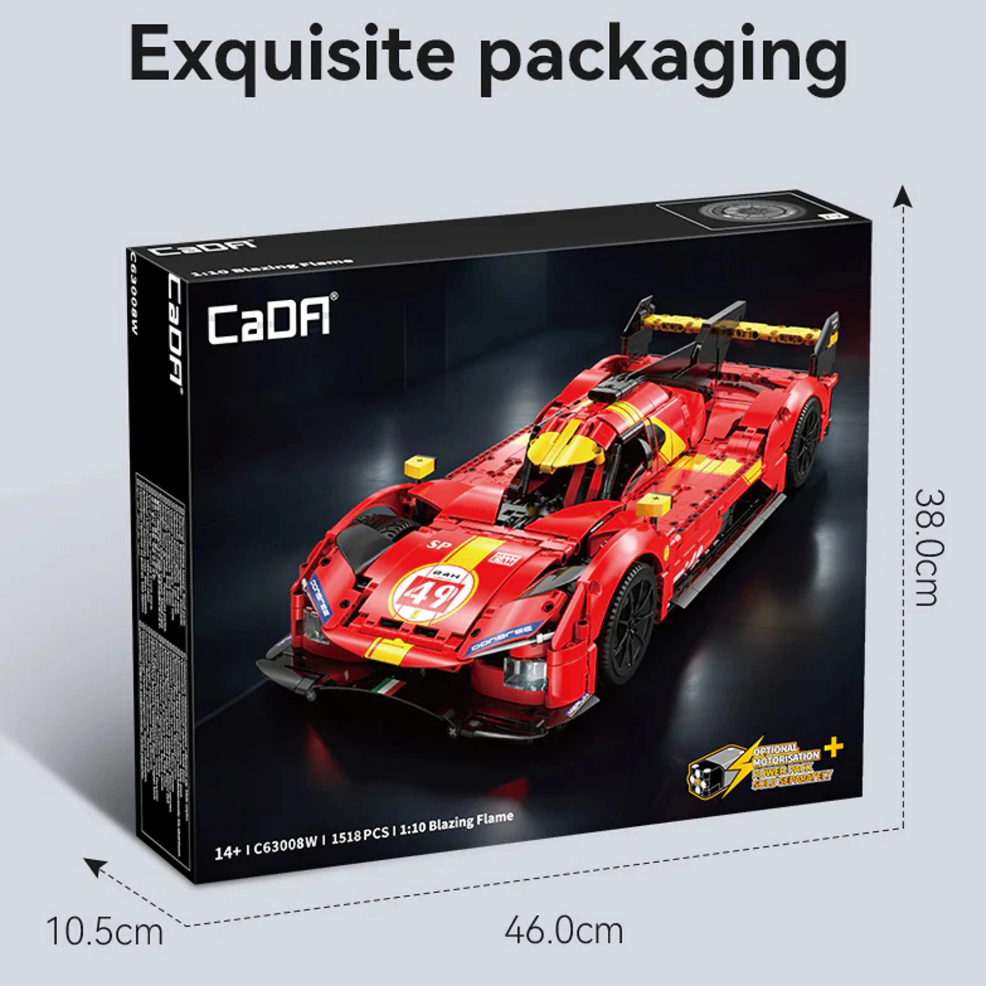 Build an impressive CaDA Blazing Flame race car at a 1:10 scale, measuring 51 cm long, from 1518 pieces. The model impresses with a detailed interior, opening doors and hood, functional steering, independent suspension, and a V6 engine replica. Optionally, you can add RC drive (compatible with Power System Pro – not included).
