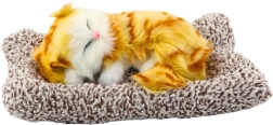 The sleeping kitten on a pillow looks real – the soft faux fur, gentle expression, and calm pose create a cozy decoration for a child’s room, living room, or office. Realistic details in ginger shades with white accents catch the eye at first glance.