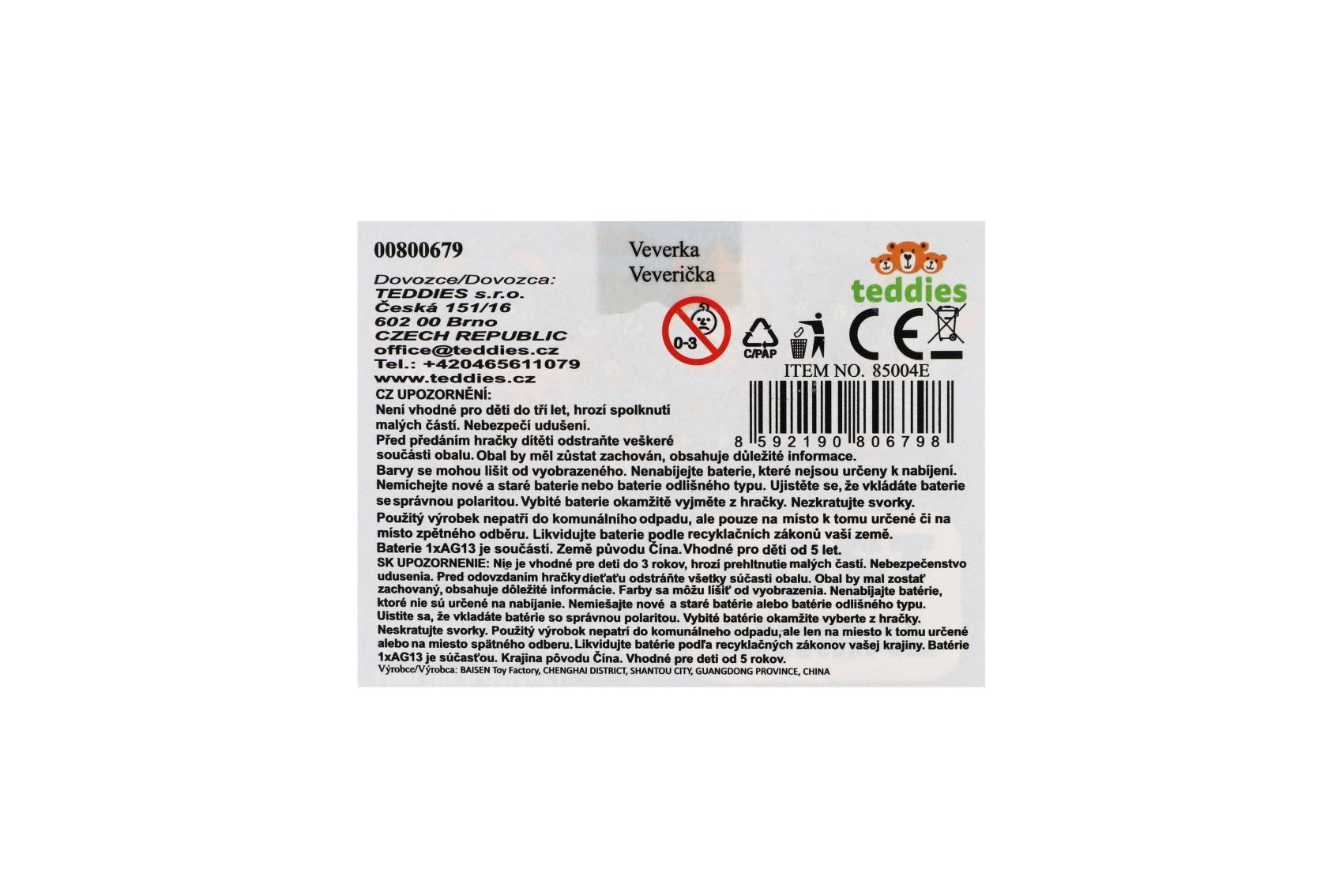 A cute interactive squirrel with a small plastic acorn delights children from 3 years. After switching ON/OFF, it moves on its own, stimulating sight, hearing, and motion perception, and its fuzzy surface is pleasant to the touch. Available in 3 color variants, packaged in a 9×7×9 cm box.