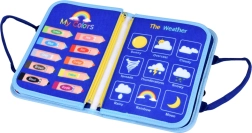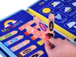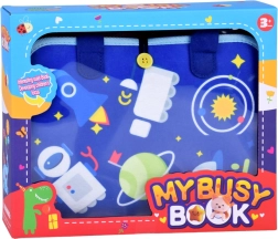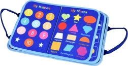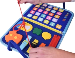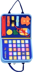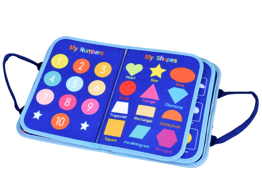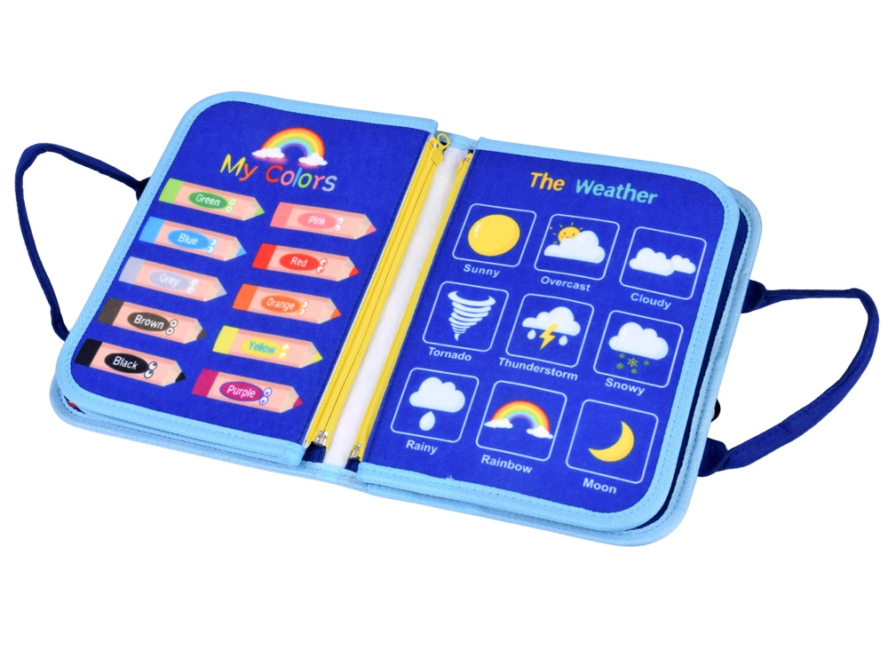 This sensory book in the form of a zippered tote with handles hides 10 colorful pages with removable felt pieces attached by hook-and-loop. While zipping and buckling, tying laces, sorting shapes, or matching letters and numbers, children practice fine motor skills, hand–eye coordination, and independence. The book is in English, ideal for first exposure to English vocabulary.