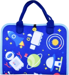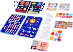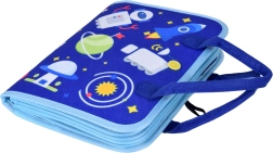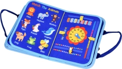 A portable textile activity book for children with 10 interactive pages that develop fine motor skills, logic, and creativity. Includes activities such as the alphabet, numbers 1–10, shapes, colors, weather, animals, calendar and clock, plus a dry-erase board with markers. Soft materials, a zipper, and carry handles ensure safe and easy handling at home and on the go.