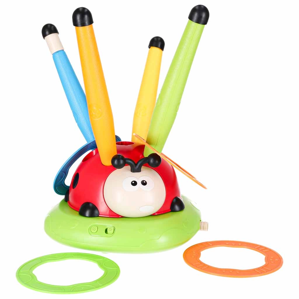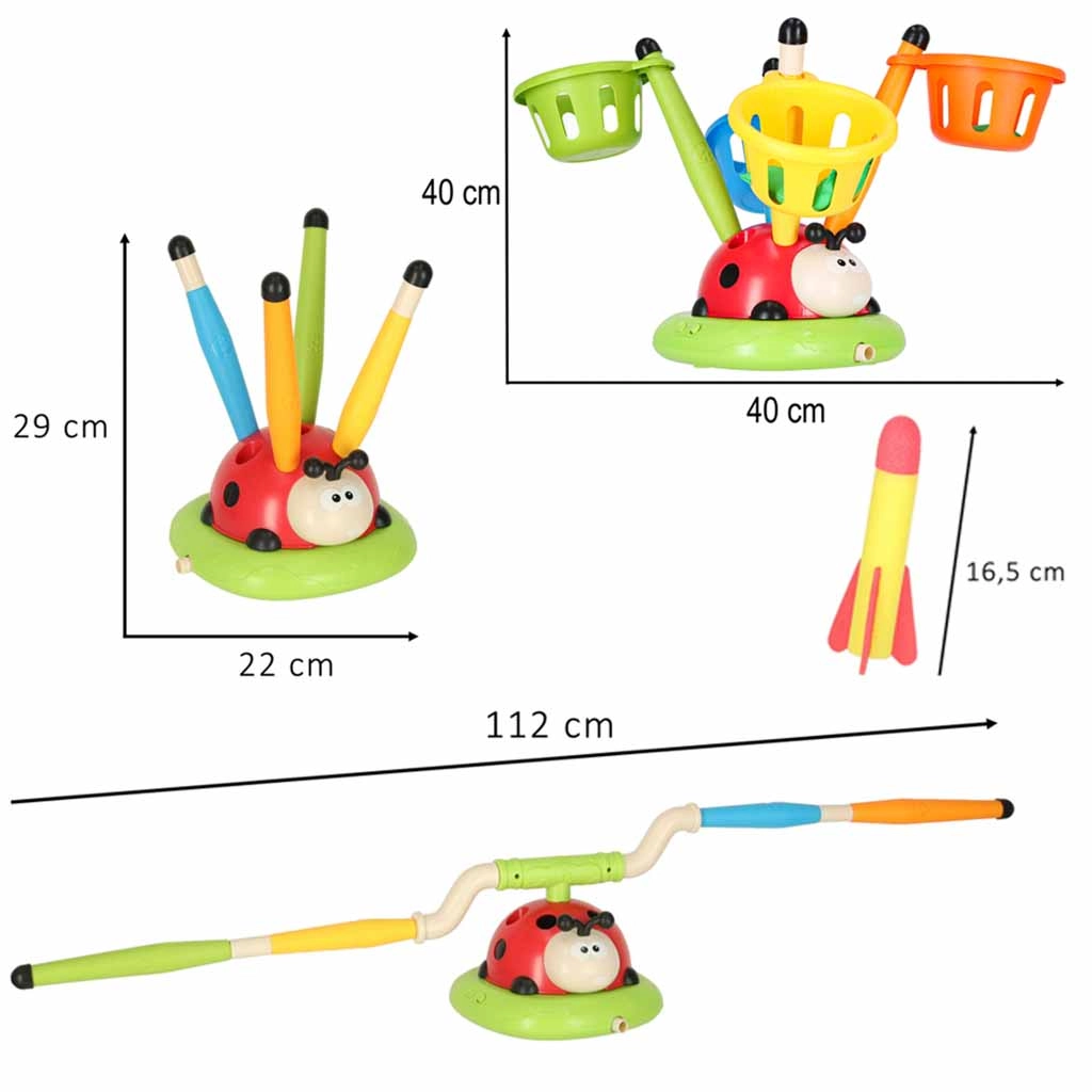 A game that won’t let you sit still: the rotating jumping obstacle tests reflexes, the air-powered launcher shoots rockets into the air, and the target toss adds a touch of friendly competition. The interactive ladybug with lights and sounds motivates movement and turns every round into a new challenge.