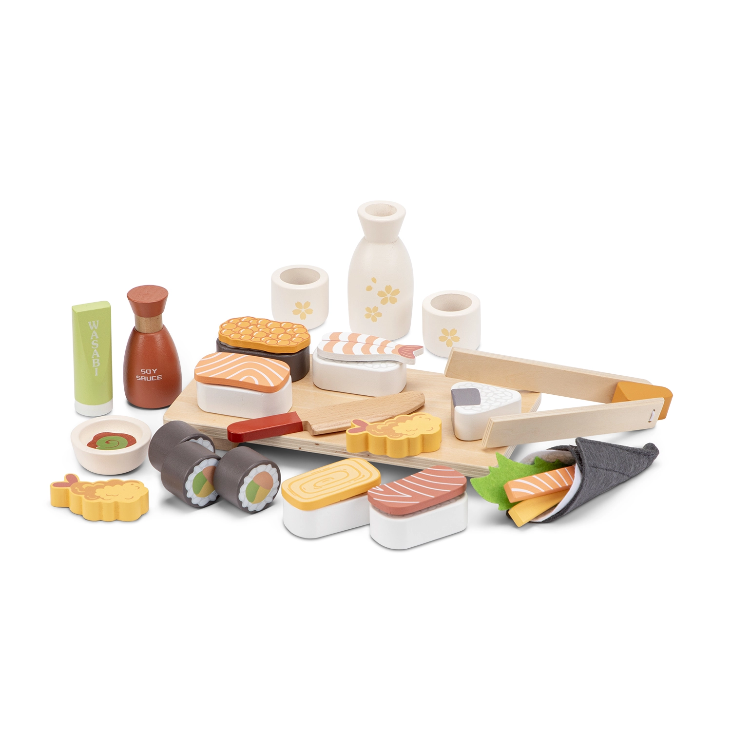 Finely painted nigiri, rolls, and sashimi, complemented by wasabi, soy sauce, and a serving board – everything for authentic chef role-play.