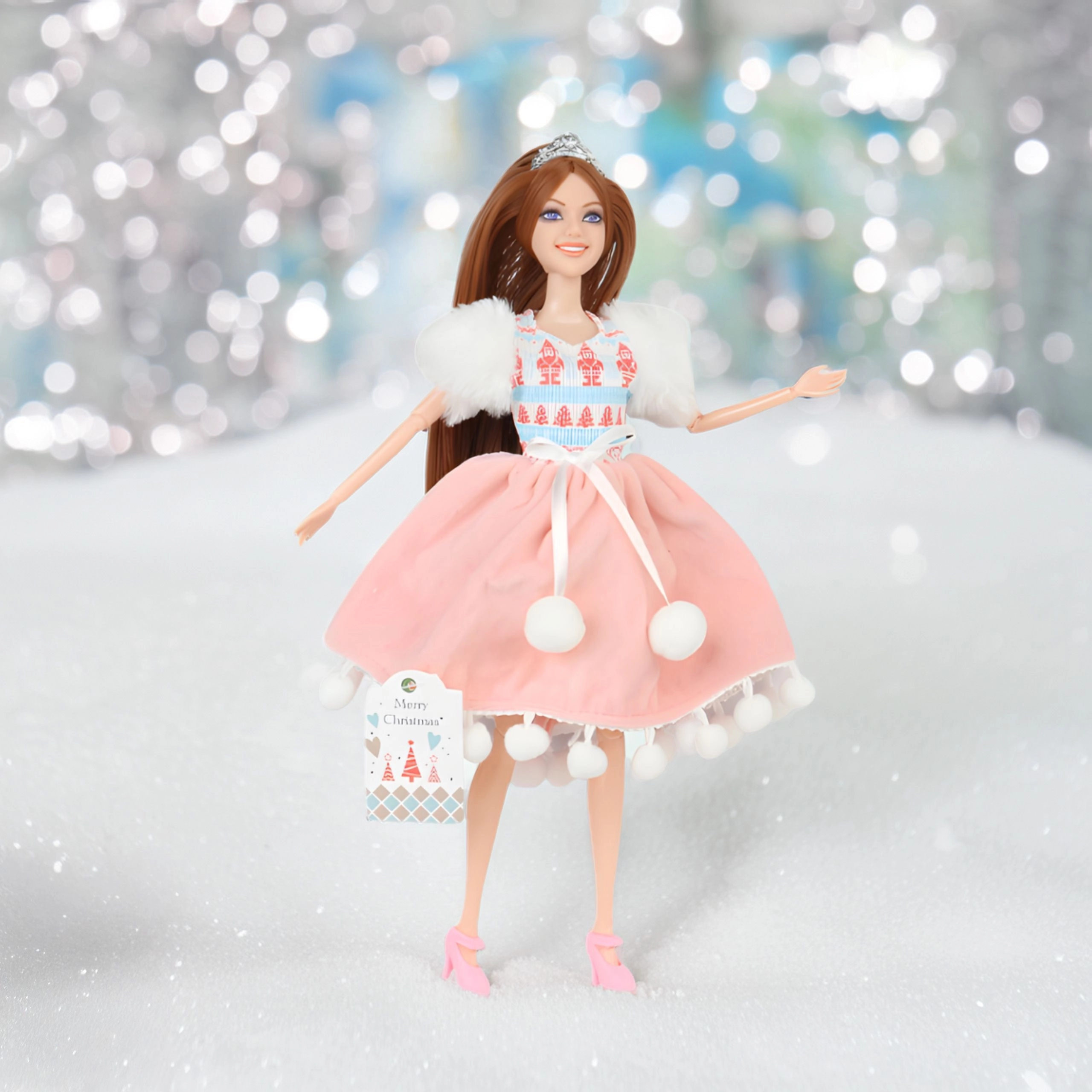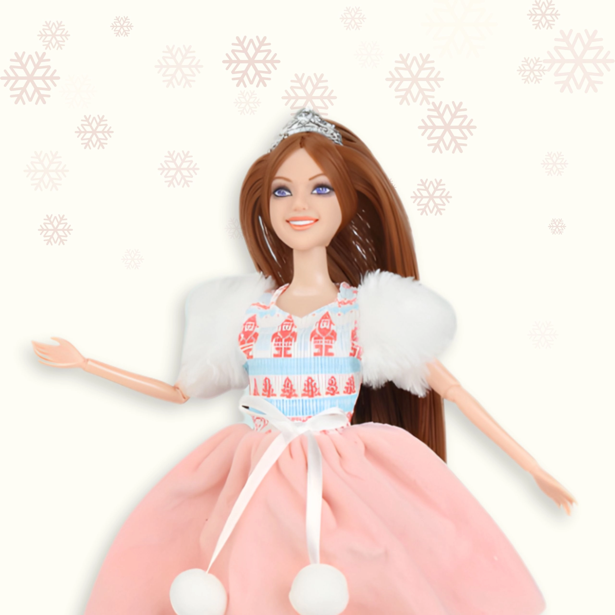 - Stylish winter doll with long brown hair and a crown