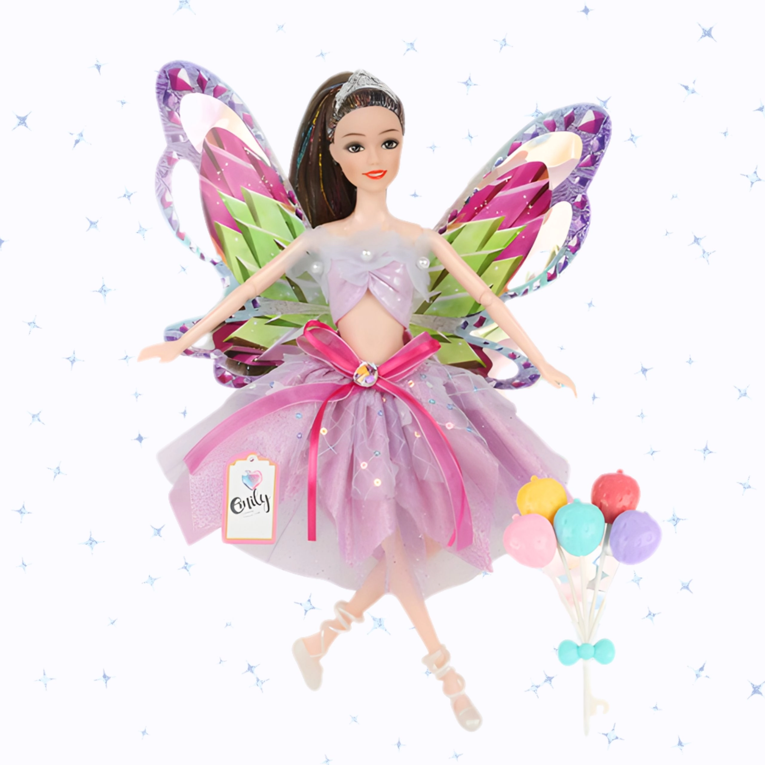 Emi doll in fairy costume, 2 hair clips, set of colorful balloons