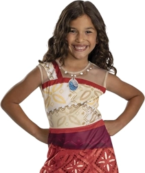 Polynesian-pattern prints, a layered skirt effect, and a blue “necklace” bring kids the atmosphere of the movie Vaiana Moana 2.