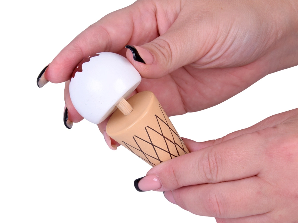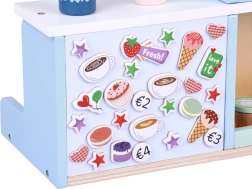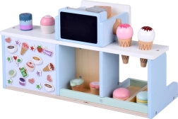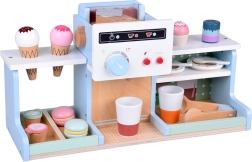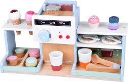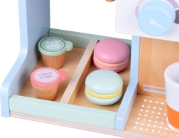 This wooden café and ice cream counter with a pastel design is ideal for little baristas and pastry chefs. Children can make coffee, tea, and serve desserts thanks to the turnable knobs, buttons, drink spout, and smart shelves and compartments for accessories. Careful workmanship from quality wood and non‑toxic paints ensures long‑lasting, safe play.