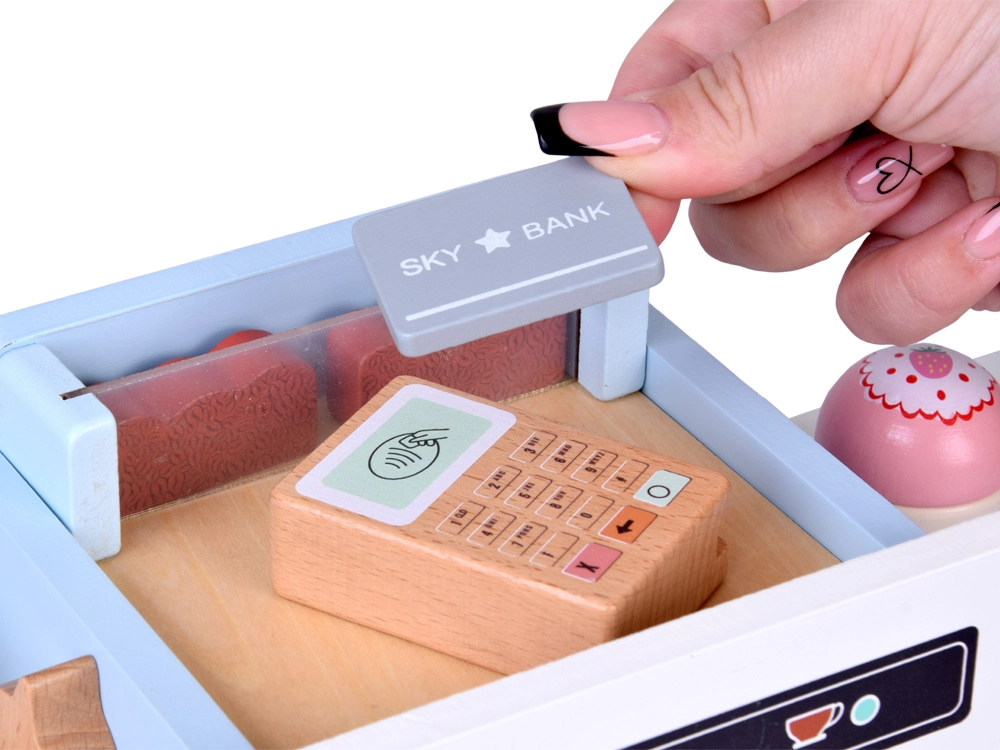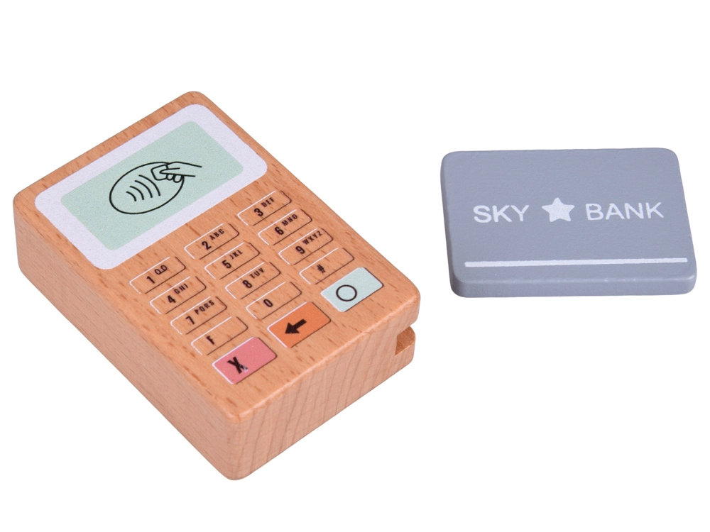 Includes a wooden payment terminal and a card for contactless “tap.” A perfect addition for role‑play as cashier and customer.