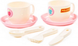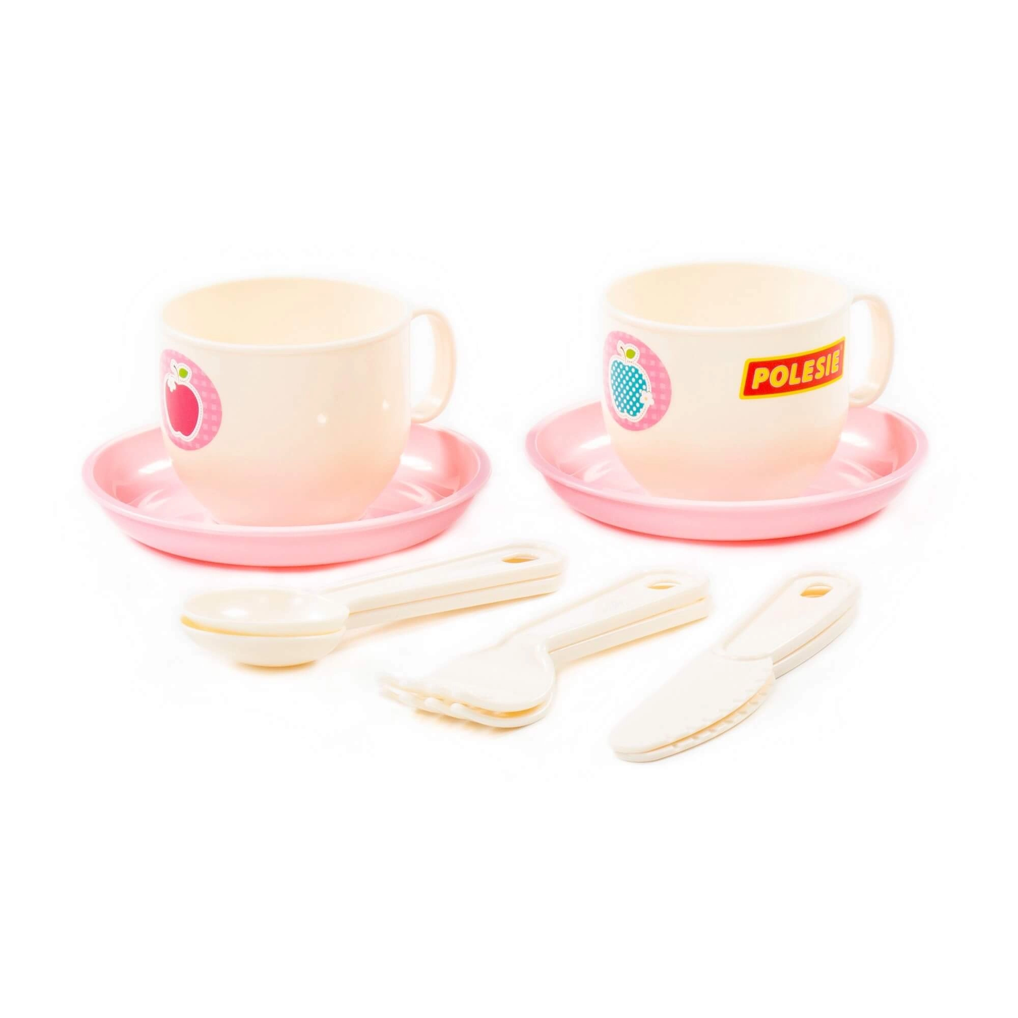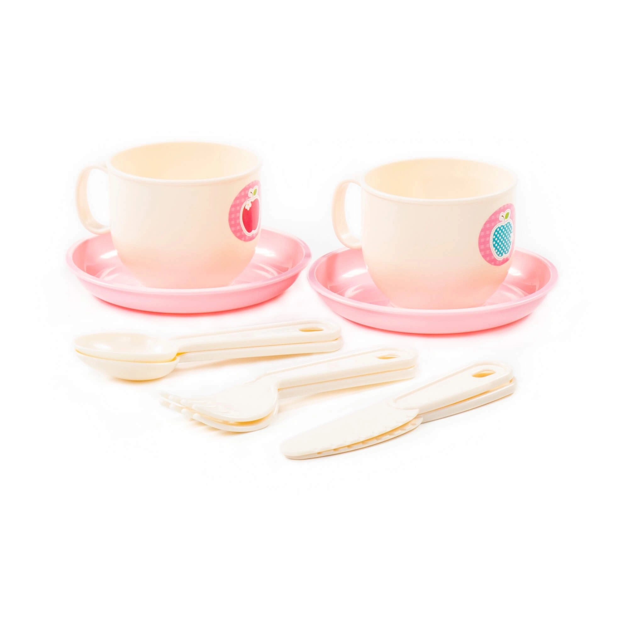 Two cups with pink saucers and cutlery let children serve like real hosts.