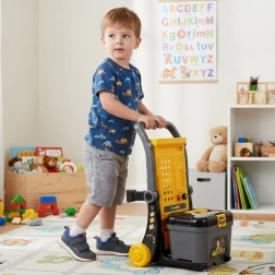 Discover a versatile 3-in-1 kids’ workshop set that transforms into a workbench, trolley, and wheelbarrow. The set of 59 pieces supports creative play, fine motor skill development, and teaches children the basics of tools. The practical toolbox keeps everything tidy, the wheels and handle ensure mobility, and the large surface offers a comfortable play area.