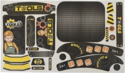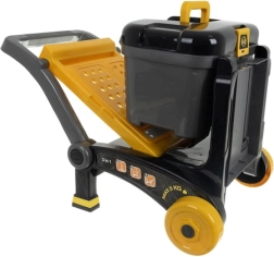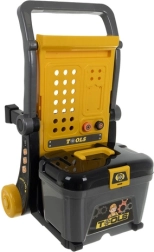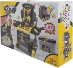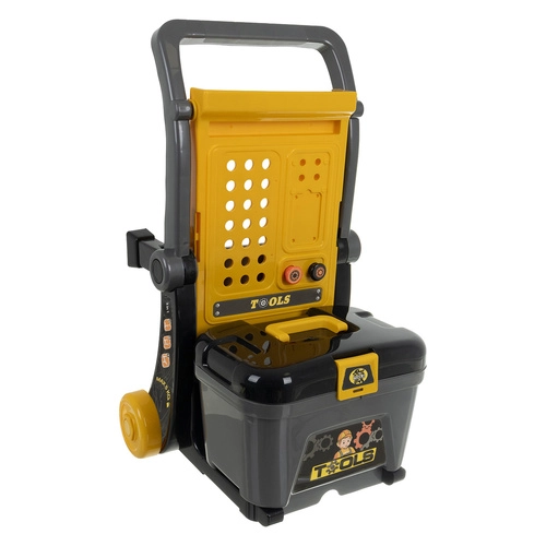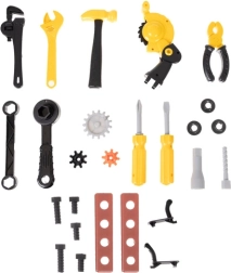 - toolbox, parts to assemble the workbench/trolley/wheelbarrow, perforated board, 2 side organizers, saw with movable blade, screws and nuts, 2 screwdrivers with interchangeable bits, wrenches (adjustable wrench, ring wrench, adjustable, socket), pliers, hammer, plates for screwing, gears, hooks and accessories, manual