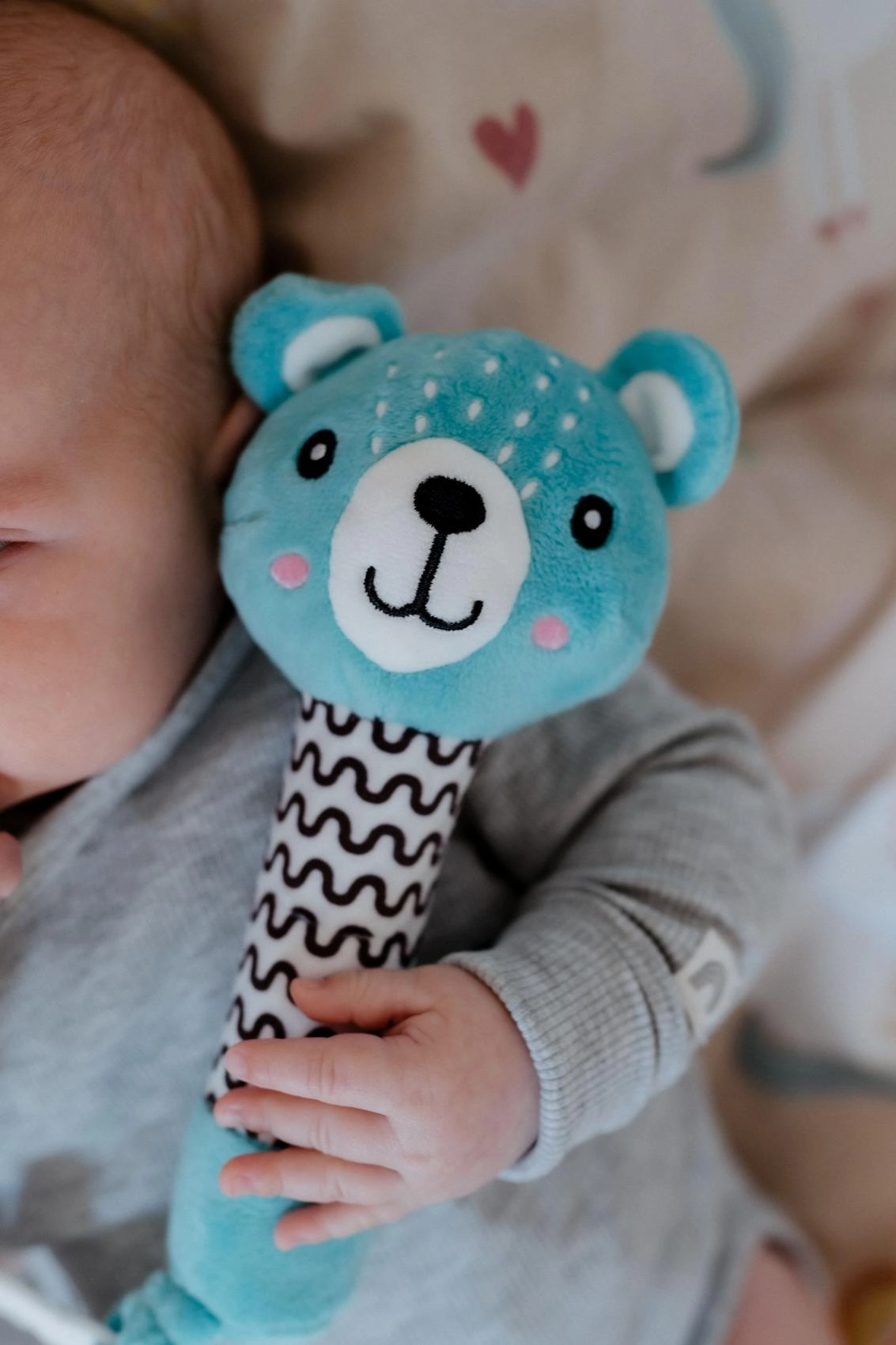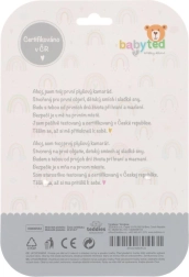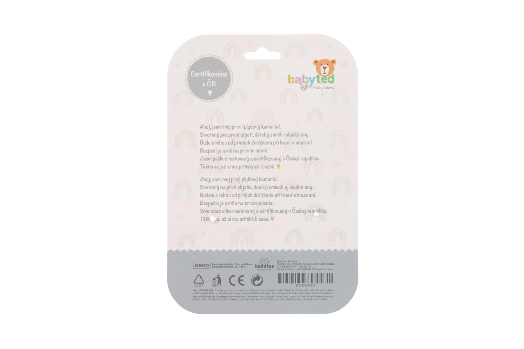 The adorable plush squeaker with a teddy bear from BABYTED is an ideal first toy for babies 0 m+. Thanks to the long, soft handle, it fits perfectly in little hands, squeaks gently when pressed, and supports auditory development. At the end, there is a soft flower-shaped teether to soothe sensitive gums. The soft, safe plush and high-contrast patterns support visual and sensory development. The toy is certified in the Czech Republic and meets strict safety standards.