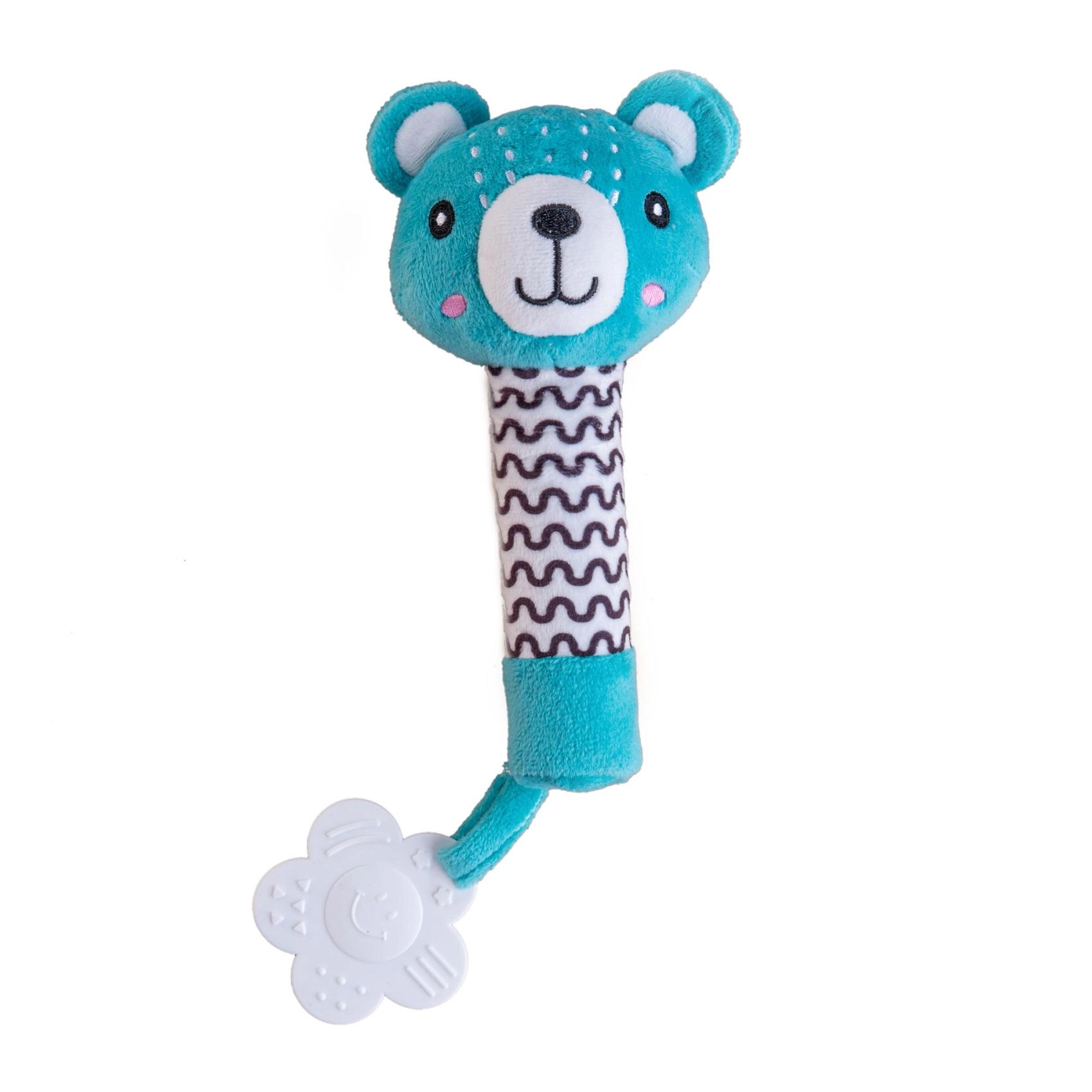 This super-soft squeaker with a teether in the shape of a teddy bear brings both comfort and fun to babies. The long, slim handle is easy to grasp, the gentle squeak stimulates hearing, and the flower-shaped teether helps during the eruption of first teeth. The plush is soft to the touch and suitable from birth.