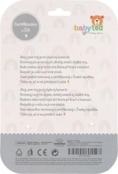 Inside is a gentle rattle to support hearing development, one corner features a soft silicone teether to relieve sore gums, and the knotted corners promote fine motor skills. The practical 25 × 25 cm size fits perfectly in a crib, stroller, or car seat.