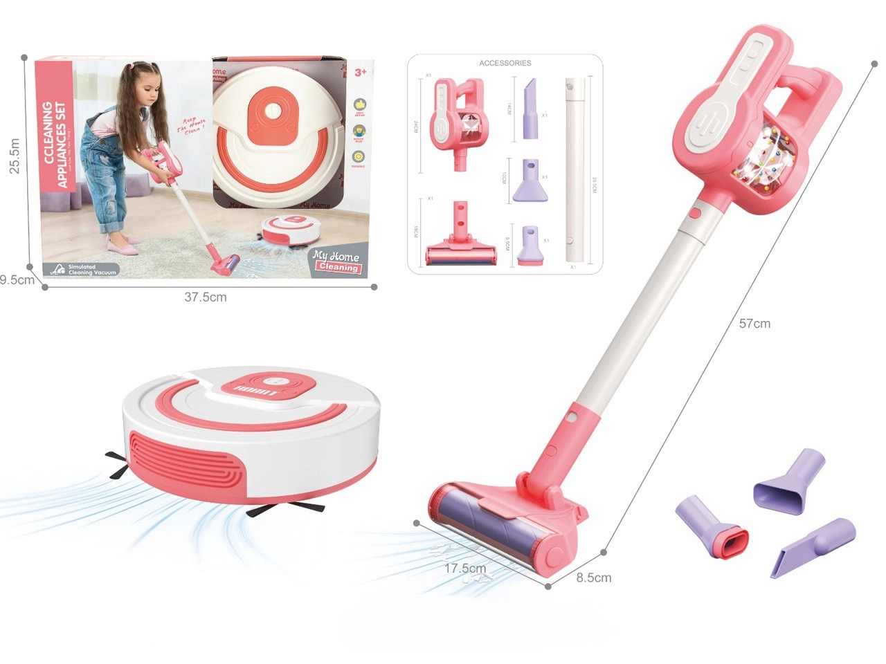 The kids’ cleaning set brings realistic household play and motivates children to help with everyday tasks. The stick vacuum with a transparent chamber and swirling beads closely mimics real vacuuming, while the robot vacuum with a suction effect and rotating brushes captivates every curious child.