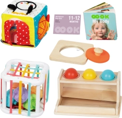 The Montessori Box 5-in-1 brings thoughtful activities for everyday exploration. Children will enjoy the elastic sensory cube with colorful blocks, wooden boxes with balls to practice object permanence, a mirror that supports self-awareness, and easy-to-grip manipulation elements. The set is designed to naturally strengthen fine motor skills, attention, and imagination.