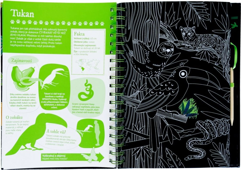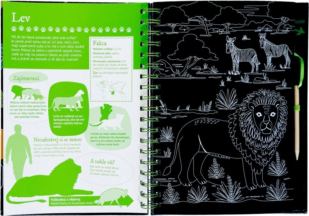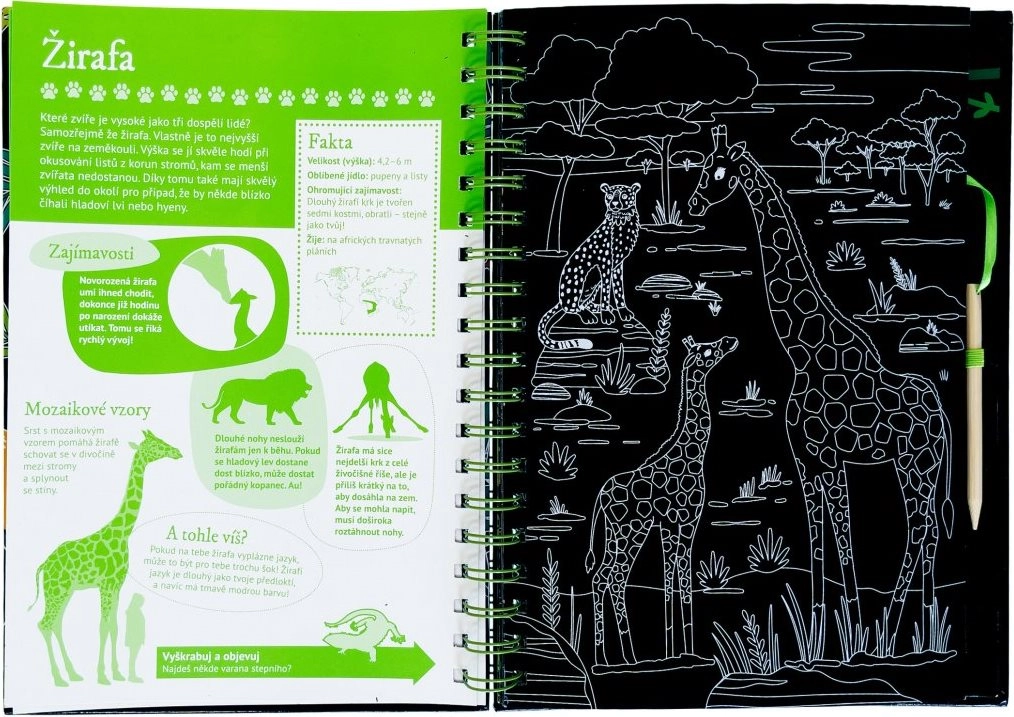 Discover the fascinating world of animals with a creative activity book that combines scratch-off pictures and fun tasks. In the first part, children learn facts about giraffes, lions, and orangutans; in the second, they will find quizzes, matching, searches, drawing, and fill-ins. Ideal for developing fine motor skills, concentration, and knowledge of nature.