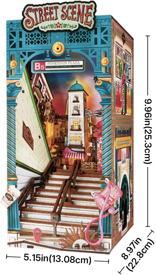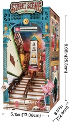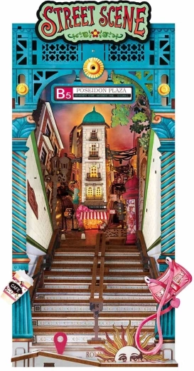 This DIY set from the ROLIFE Book Nook series transforms your bookshelf into a picturesque city alley. The upper part of the scene offers a street-level view — complete with lamps, signs, paving, and glowing windows. At the bottom by the stairs, you’ll find small props of city life like a paper coffee cup or a pink handbag, and for travel lovers, a sun and map pin motif. When slid into a shelf, a clever element surprises you: beneath the stairs is a mini station that reveals itself when pulled out.