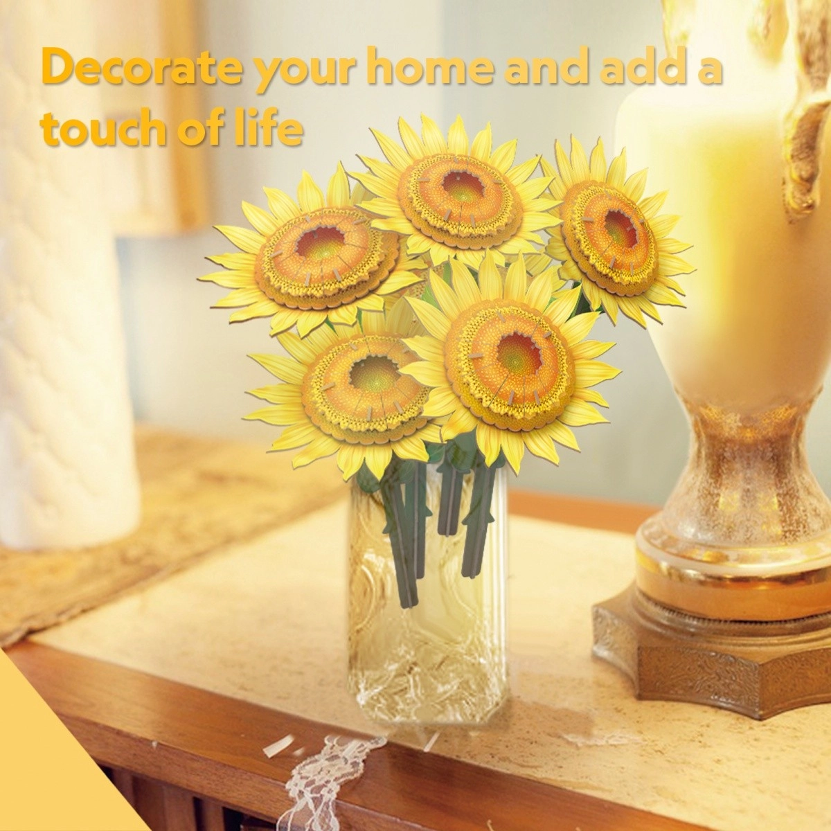 Charming 3D puzzle to create a realistic sunflower bouquet that brightens any interior. Ideal as a creative gift and a design decoration you can assemble without mess or tools. Simply pop the pre-cut pieces out of the sheets and assemble step by step.