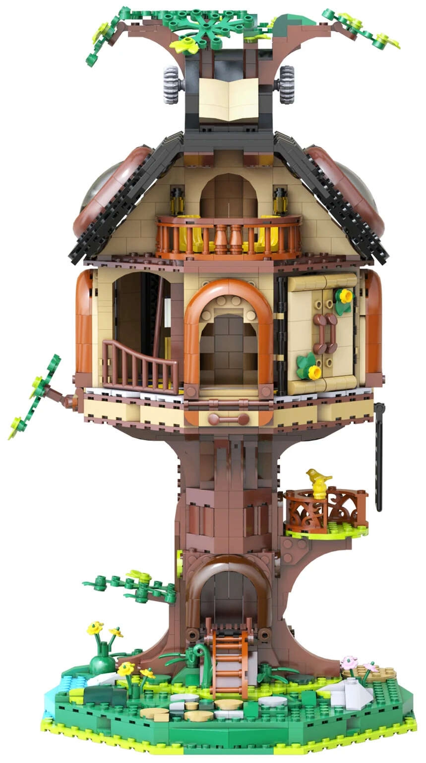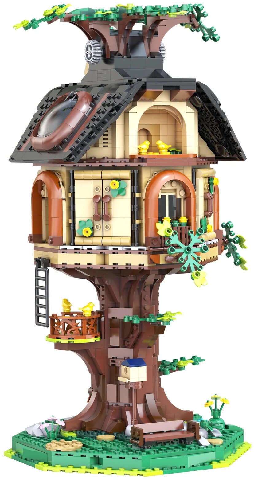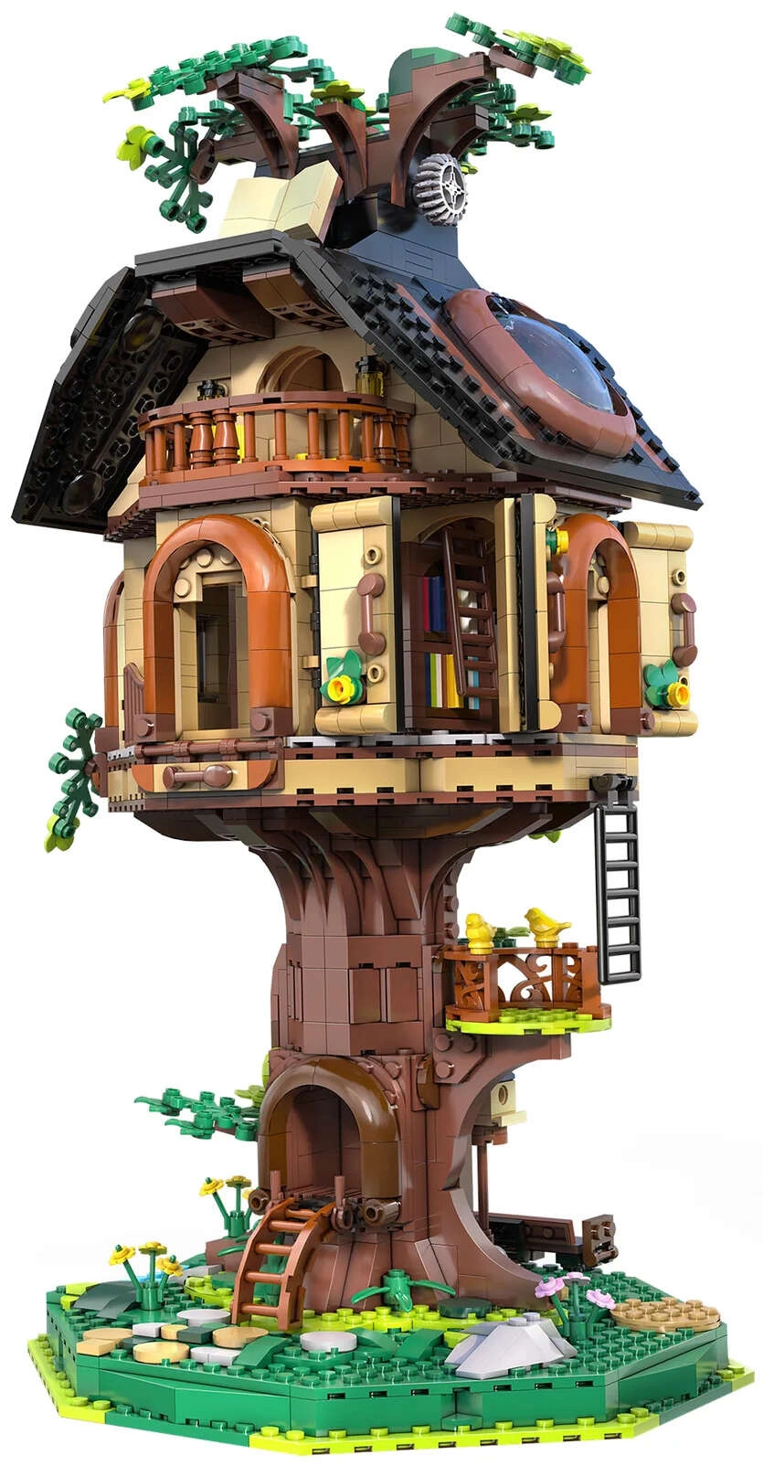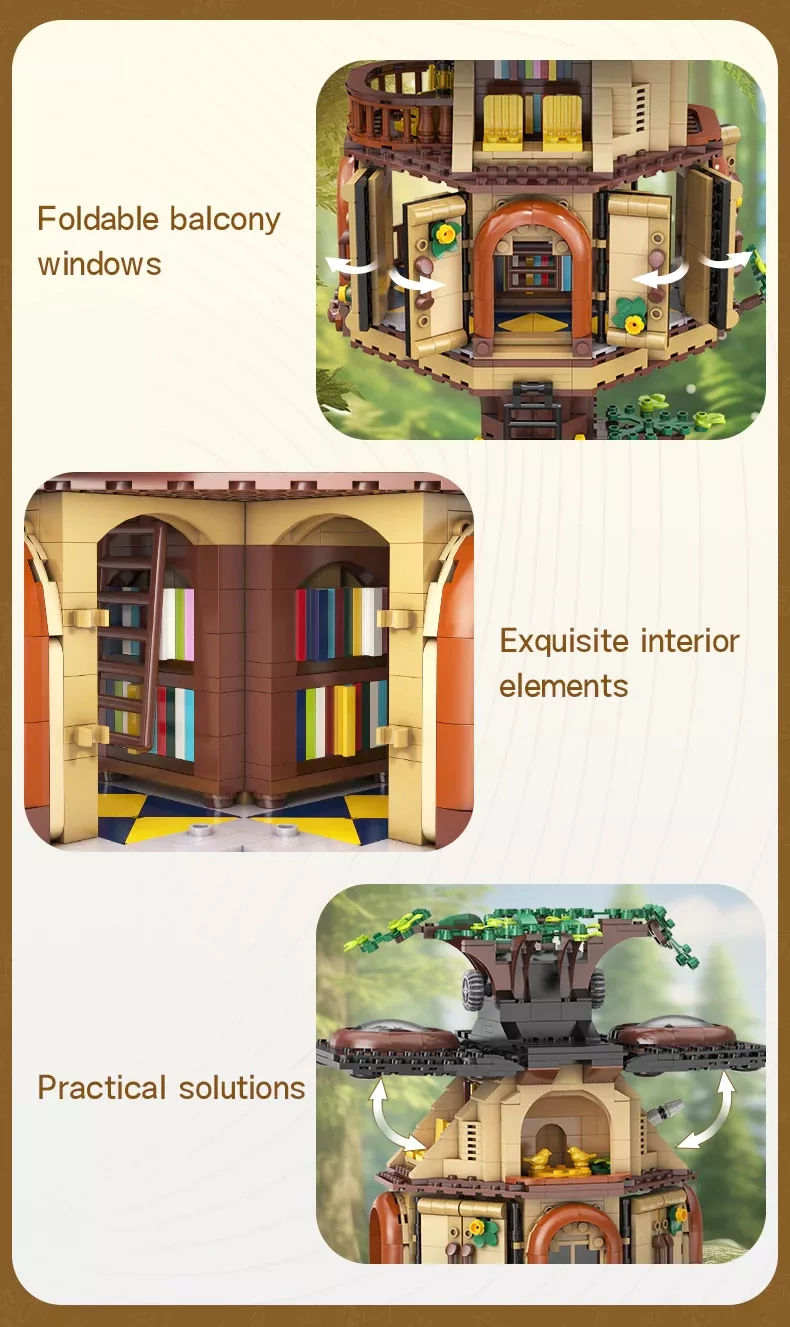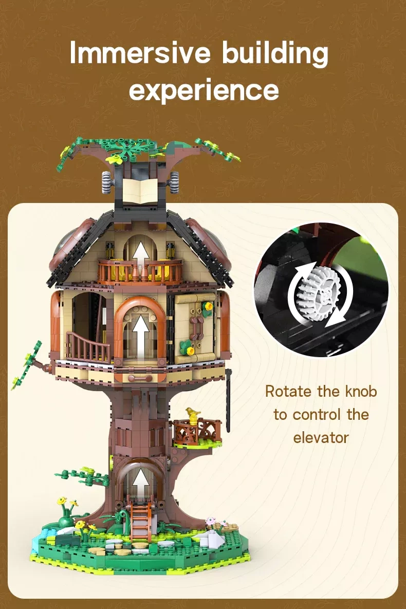 The model impresses with rich equipment and functions: a rotary-knob-controlled elevator at the top of the tree, folding shutters, openable sections for peeking inside, and USB LED lights that accent details on display. The set is great for developing patience and creativity and also makes a beautiful interior decoration.