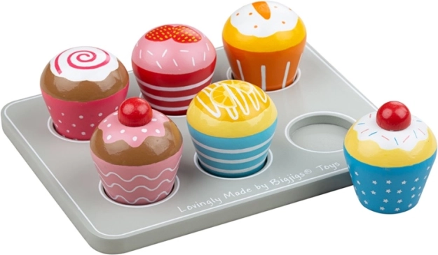 Give children the joy of creative play with BIGJIGS TOYS wooden muffins. The set includes six delicious-looking pieces plus a tray, so they’re always ready to serve. Each muffin has a unique design that invites mixing and matching and role play in a play kitchen or shop.