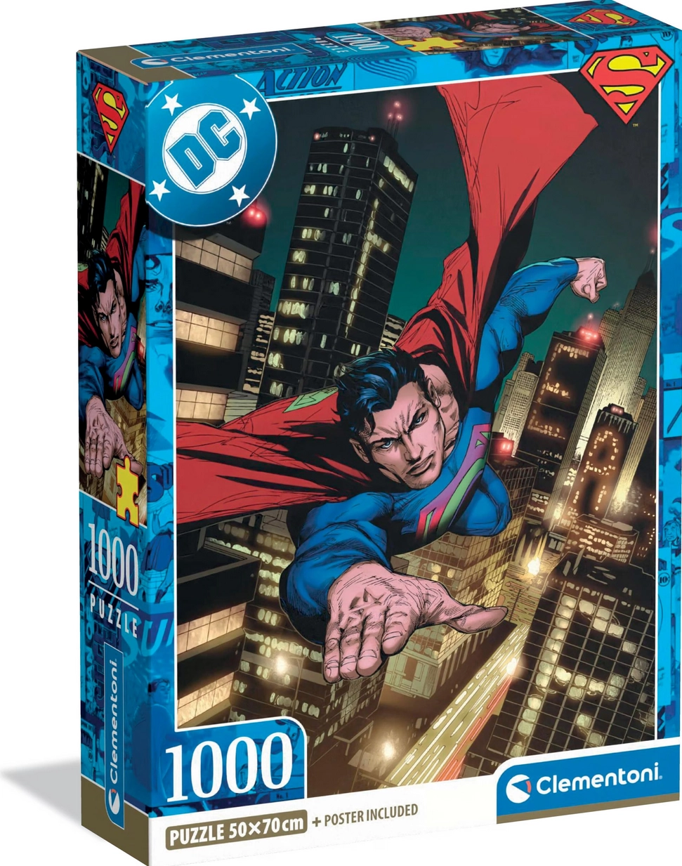Enjoy a premium jigsaw with the iconic DC hero. The Clementoni puzzle featuring Superman – Guardian offers 1000 pieces, precise printing, and a finished size of 50 × 70 cm. Perfect for relaxation, focus, and comic art collectors.