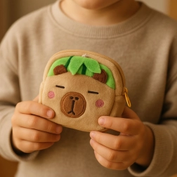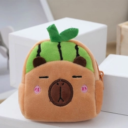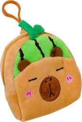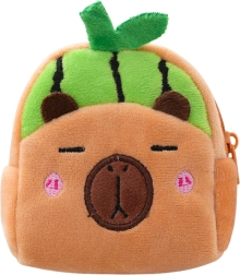 A cute and practical mini wallet shaped like a capybara with a green watermelon motif. The soft plush is pleasant to the touch, it has a zip closure for safely storing small items and a plastic clip for attaching to a backpack or keys. The compact size of 9.5 × 8 cm fits in a pocket, bag, or school backpack.
