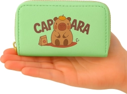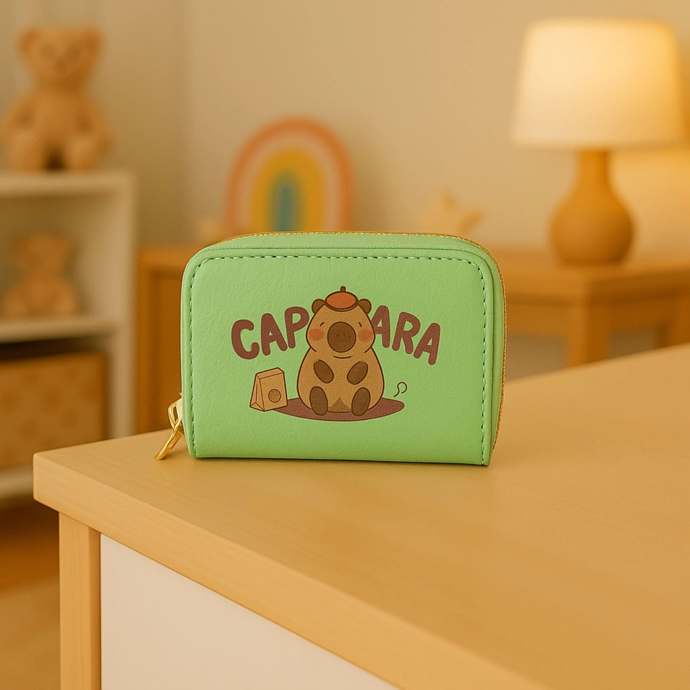 A compact green wallet with a cute capybara motif featuring two separate zip compartments and an accordion-style interior for neatly organizing cards, banknotes, and coins. Durable leather-textured material, gold zippers, and practical dimensions make it an ideal accessory for kids, teens, and adults alike.