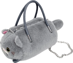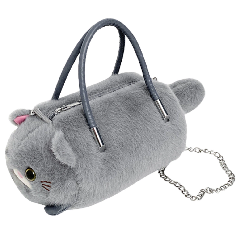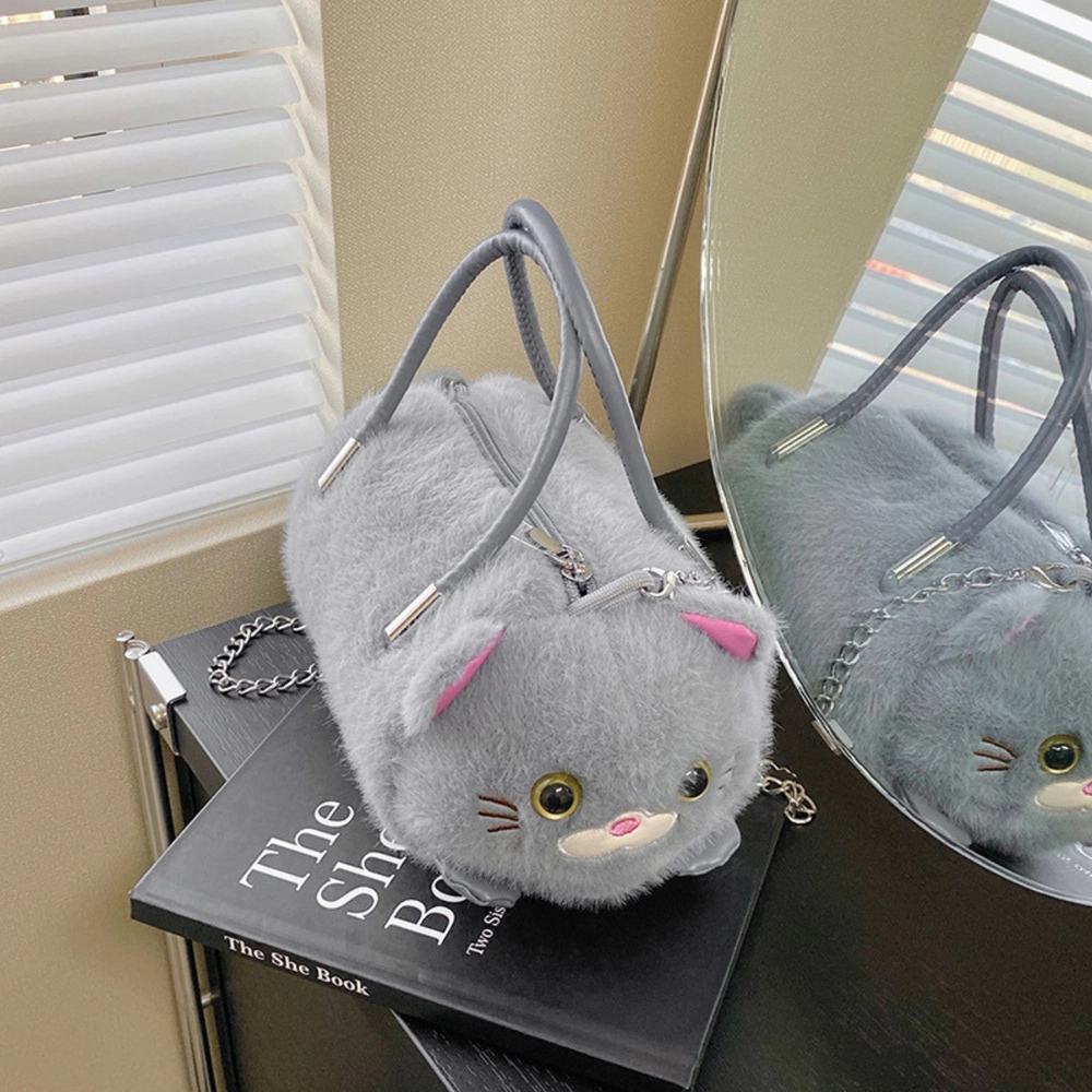 A cute gray cat-shaped handbag combines super-soft plush with practical design. It features two sturdy handles, a detachable metal chain for shoulder wear, and a secure zip closure. Ideal for small essentials for kids, teens, and adults who love unique accessories.