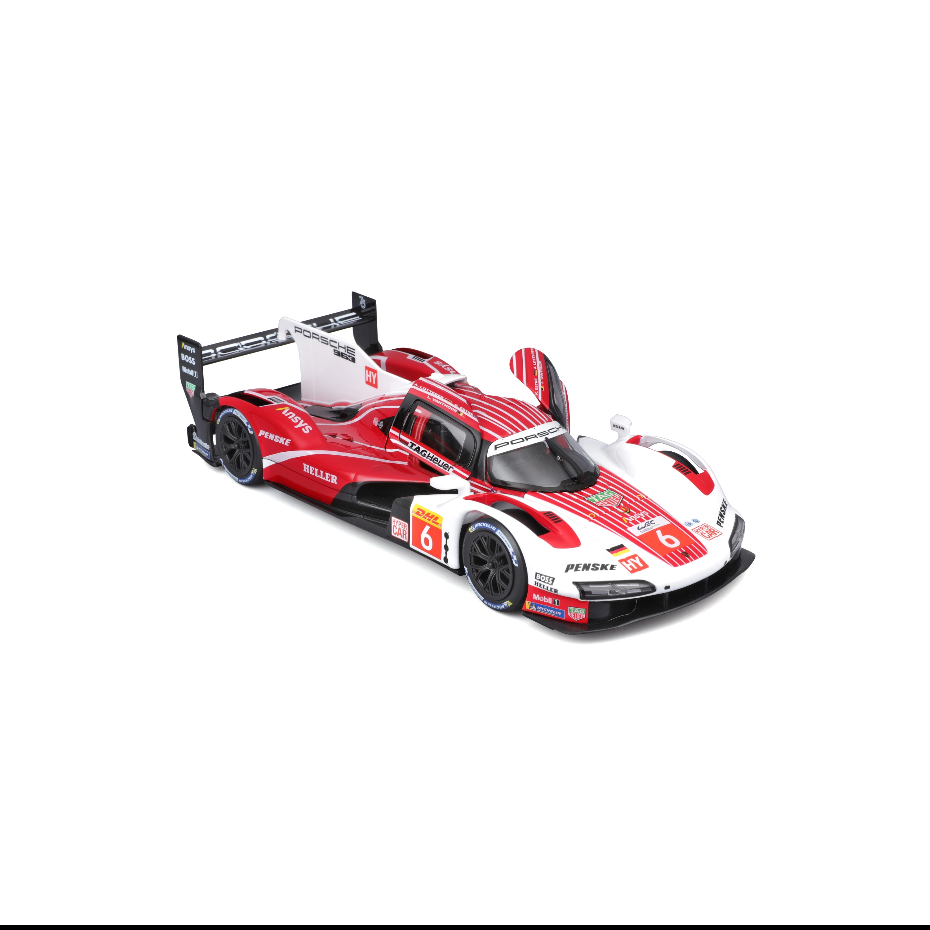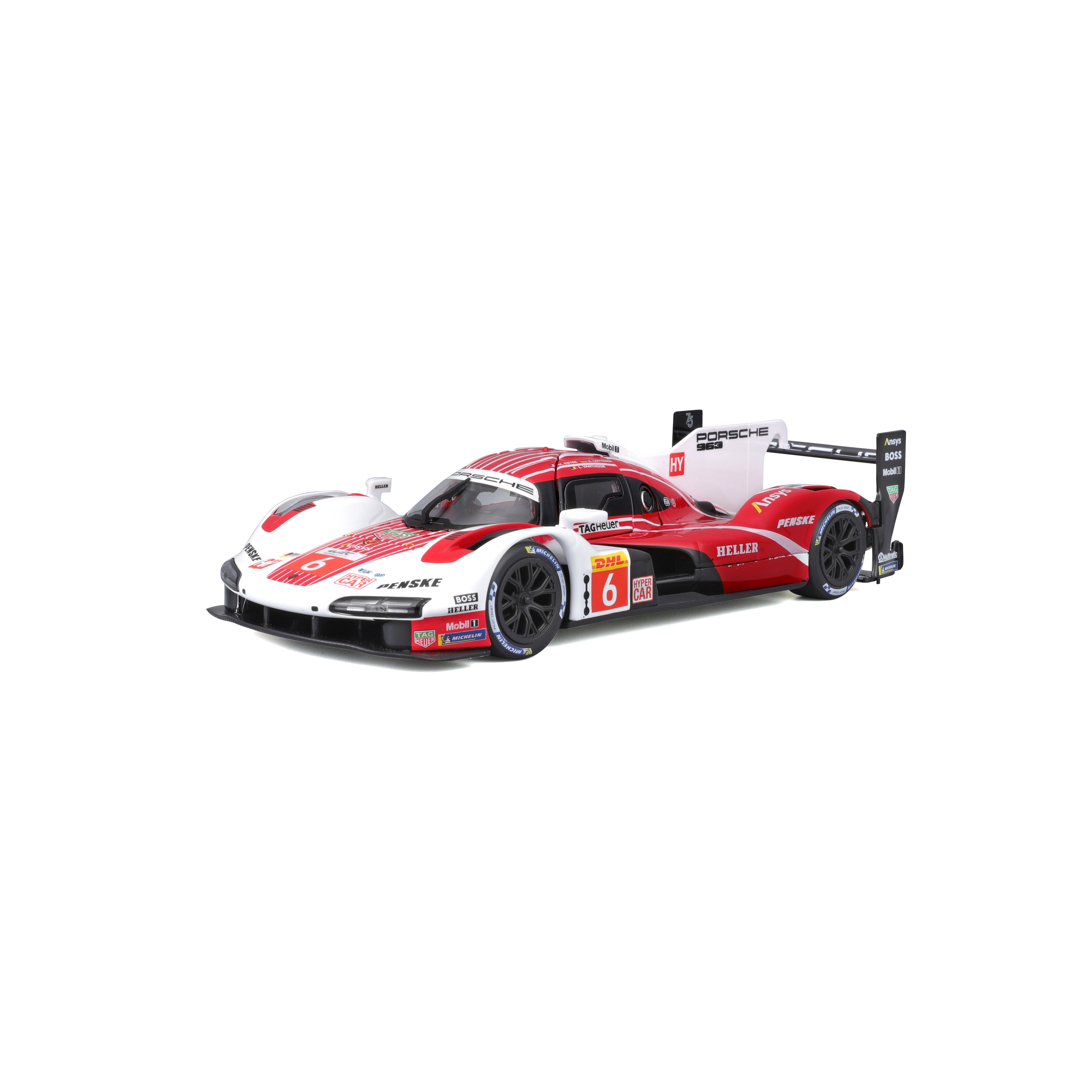 The Bburago 1:24 model faithfully captures the character of the PORSCHE 963 (2024) endurance prototype in racing red-and-white livery with sponsor logos. A metal body with plastic add-ons, precise lines, and authentic aerodynamic features underscore its display appeal and collector value.