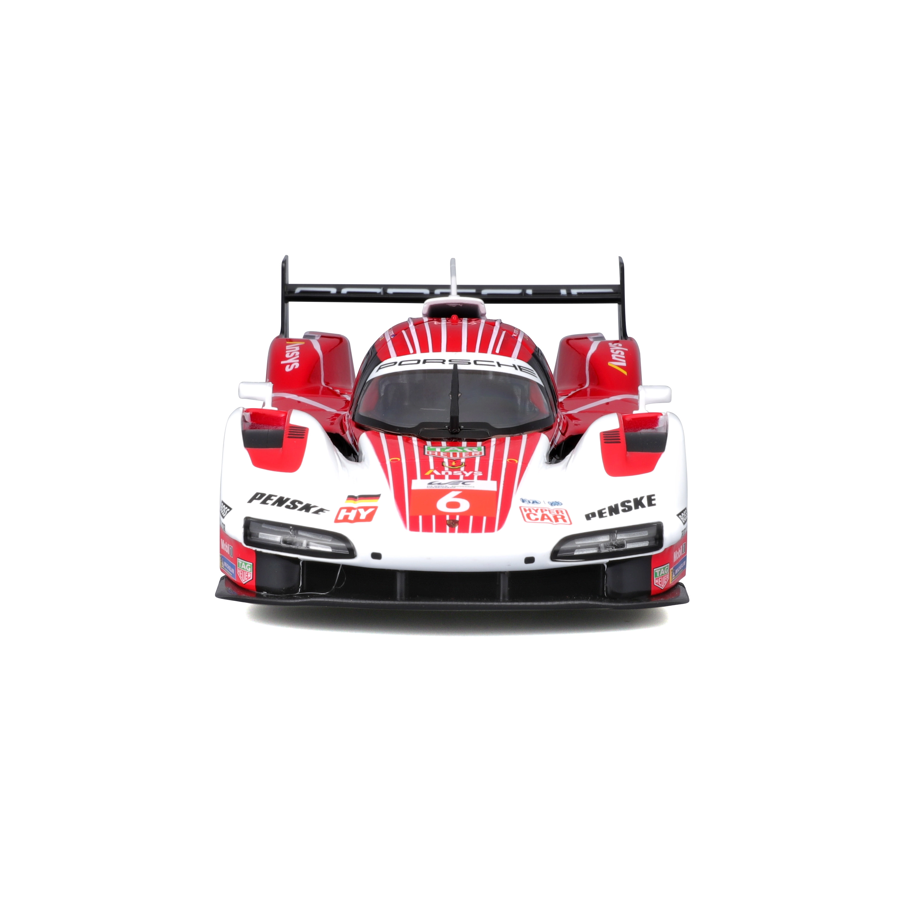Accurate proportions of the PORSCHE 963 with splitter, fins, and a massive rear wing for an authentic racing look on display.