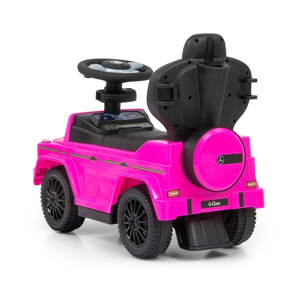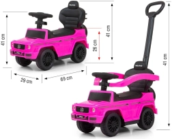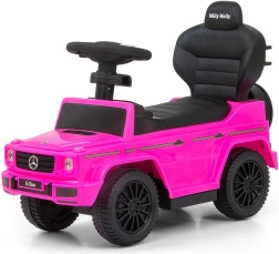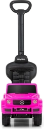 The licensed MERCEDES G350d ride-on in pink looks like a real off-road vehicle and motivates children to move actively, training balance and motor skills. Thanks to the high backrest, side armrests, and push bar, it suits children who can already sit as well as little walkers. After removing the push bar, armrests, and footrests, it converts into a classic ride-on.