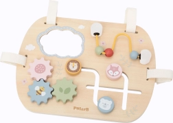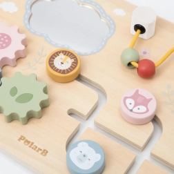 The VIGA wooden activity board from the PolarB collection is a great educational toy for little explorers. It features a mirror, a bead maze, gears, and a sliding element that capture attention and support the development of the senses and motor coordination. Thanks to its pastel colors and pleasant wood finish, the board encourages curiosity and learning through play.