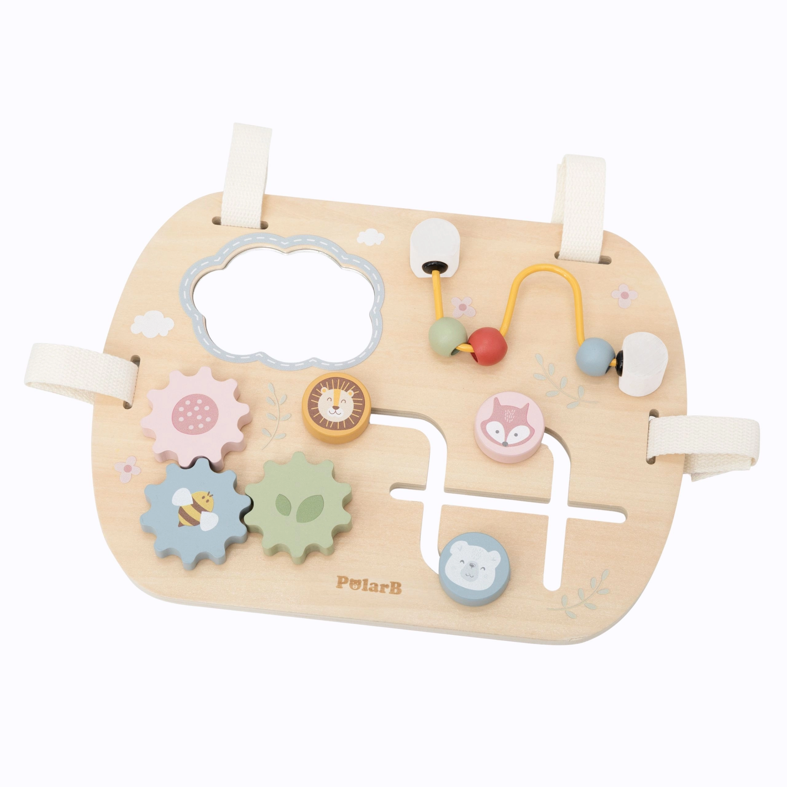 The VIGA PolarB activity board combines safe wood, thoughtful design, and soft pastel colors to engage children while developing their skills. The elements are easy to handle and promote fine motor skills, visual-motor coordination, and logical thinking. With four cotton straps with hook-and-loop fasteners, it can be attached to a crib or stroller, or used freely on a flat surface.
