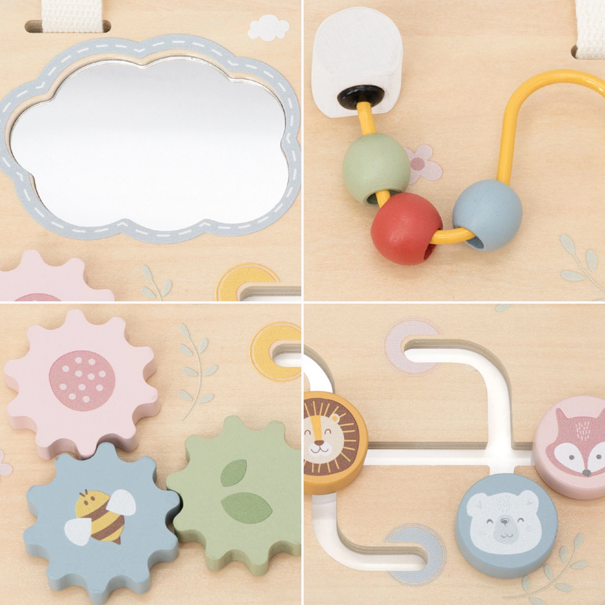 - Multiple activities in one – mirror, maze, gears, and slider keep a child’s attention.