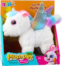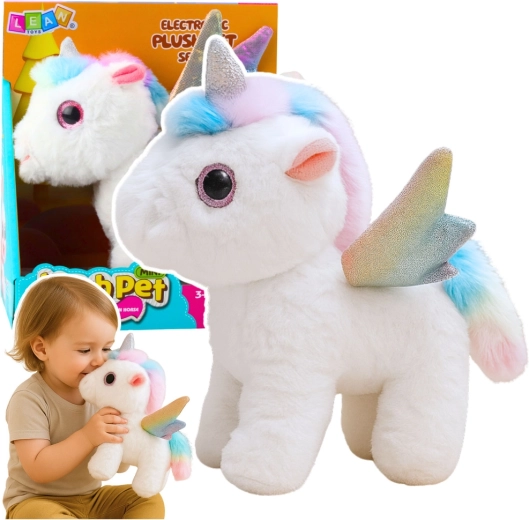 A cute interactive unicorn made of soft plush will delight every child. When turned on, it moves forward and makes sound effects, featuring a sparkly horn, a rainbow mane and tail, and shiny wings. Perfect for imaginative play and cuddling.