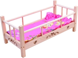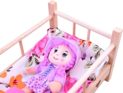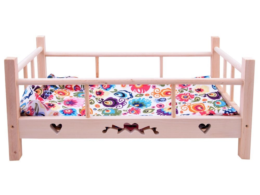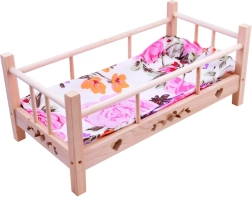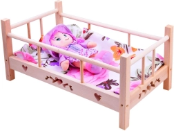 Adorable wooden doll bed for dolls up to 50 cm tall with a super-soft pillow and blanket. Made from natural untreated wood, it has sturdy sides and a stable construction for long, safe play. Includes a fabric mattress. Natural wood, quality craftsmanship, and a complete bedding set will delight every little caregiver.