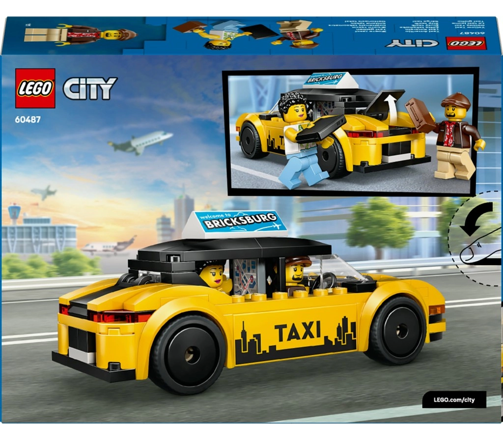 The yellow body with black stripes, TAXI sign, and “Welcome to Bricksburg” ad panel gives the model a realistic look in any LEGO City scene.