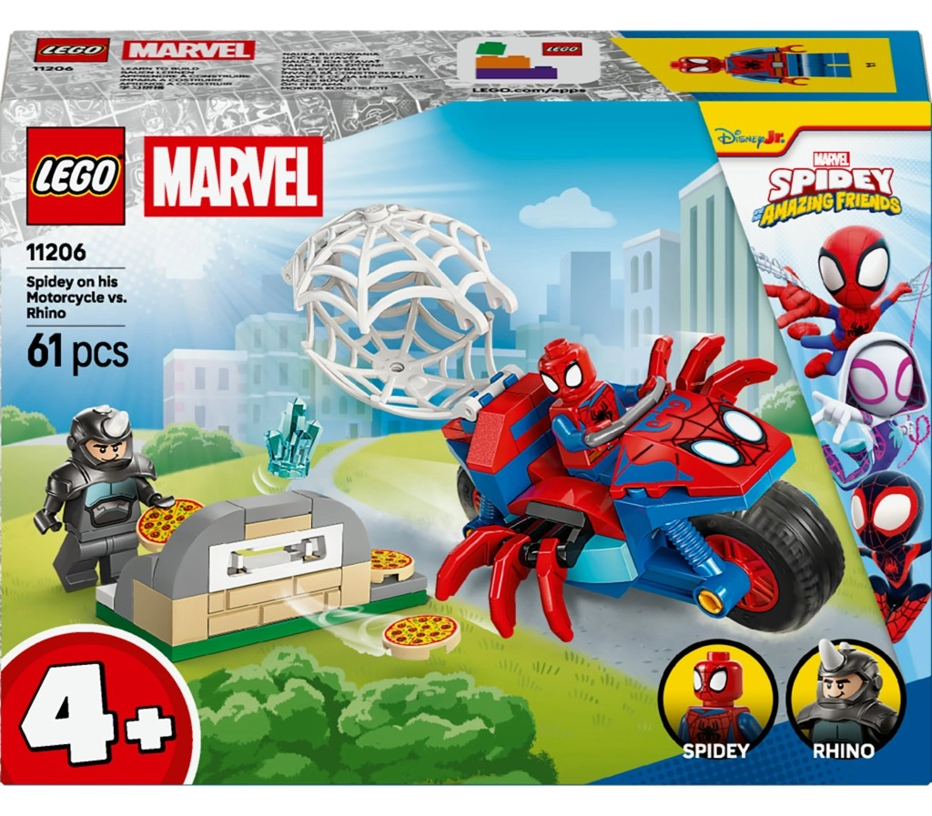 Step into an action-packed world of superheroes with this LEGO set for kids aged 4+, where SPIDEY on his spider motorcycle faces the villain RHINO. Enjoy easy building from 61 pieces, two minifigures, a cool motorcycle with a web, and a fun pizza oven for imaginative stories. An ideal gift for young fans of MARVEL and the series “Spidey and His Amazing Friends”.
