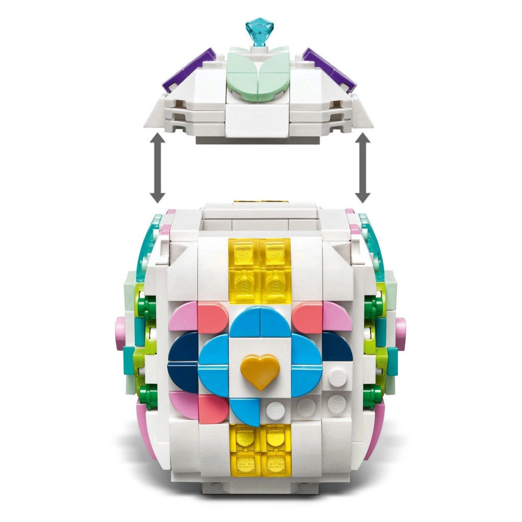 This elegant white LEGO brick egg is approximately 10 cm tall and 7.9 cm wide — the ideal size for a shelf, table, or Easter arrangement. Thanks to the rich selection of pastel and transparent pieces (hearts, leaves, “diamonds”), you can easily create a unique pattern and change it anytime.