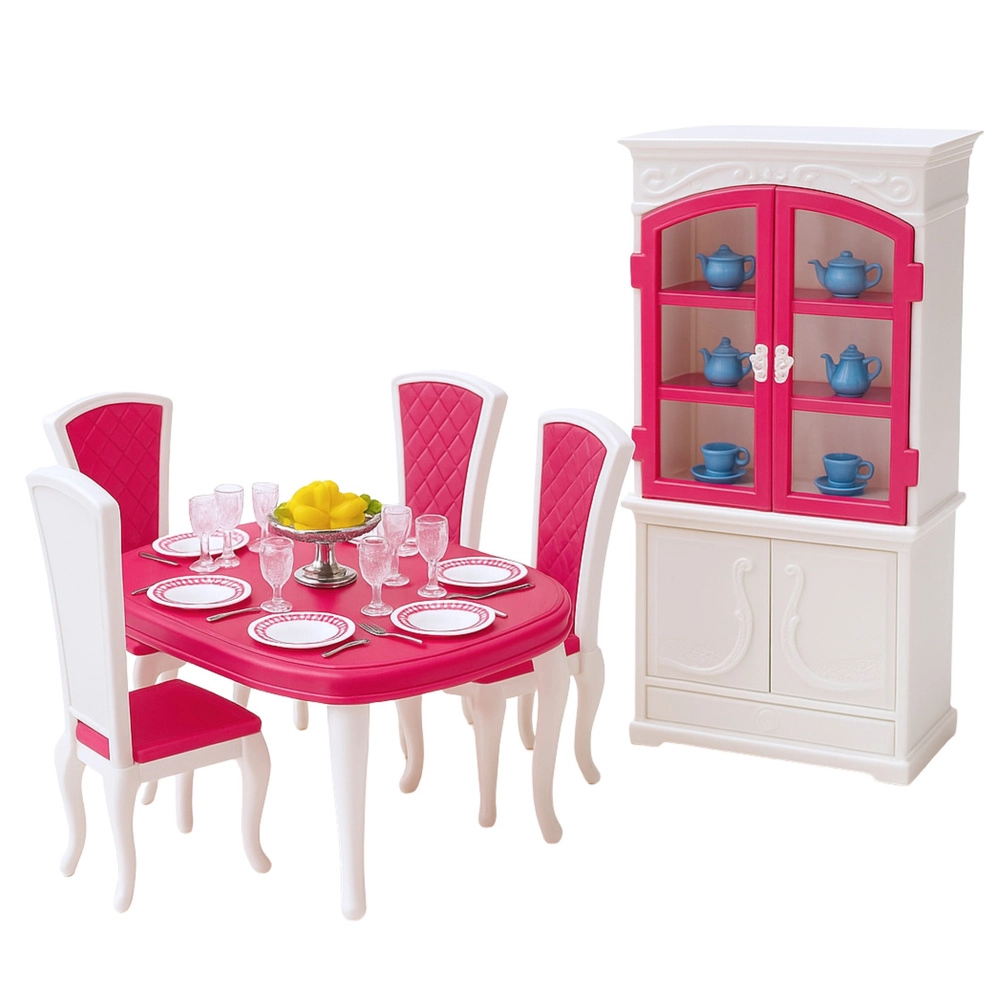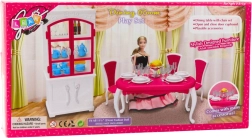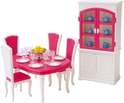 An elegant furniture and accessories set for dolls around 29 cm that turns any dollhouse into a realistic dining room. Includes a table, chairs, a sideboard with opening doors, and a rich selection of table settings. Durable plastic construction, a pink‑white color scheme and a classic style support creative play, development of social skills and role‑play scenarios. Meets CE and EN71 standards.