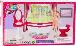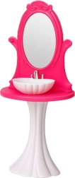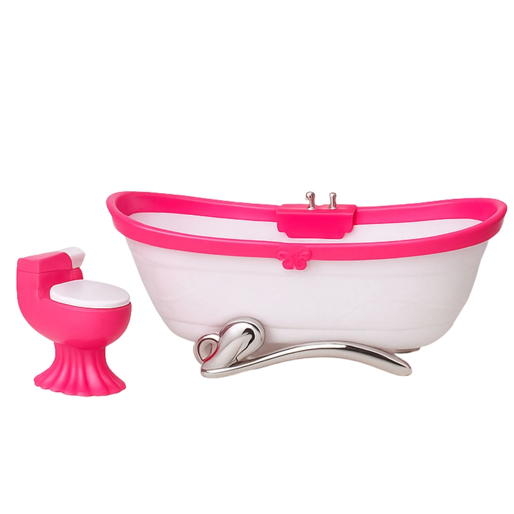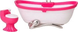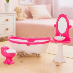 A stylish bathroom set for dolls about 29 cm tall brings realistic play of everyday activities. It includes a bathtub, a toilet with an opening lid, and a sink with a mirror. The lightweight and durable plastic construction, pink-and-white color scheme, and detailed design perfectly complement a dollhouse or standalone themed play.