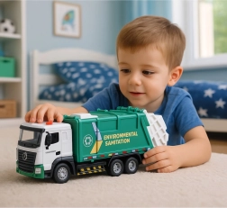 This finely detailed garbage truck set gives children an authentic experience of municipal services at work. Thanks to the metal cab, the toy is durable and safe, and the opening doors let kids peek inside for more realistic play.