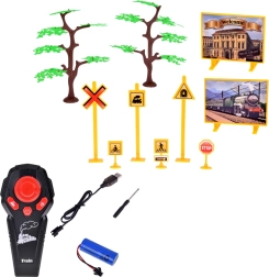 - locomotive, coal car, passenger car, freight car, straight and curved tracks, 2.4 GHz RC controller, battery, USB charger, water bottle