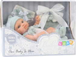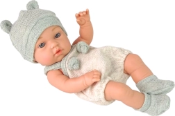 A cute 18 cm baby doll delights with realistic details and a pleasant, soft material. Thanks to movable limbs and head, the doll can be easily seated or laid down. It is dressed in a white bodysuit with grey accents, has a soft cap with ears and a bib with a bow – ideal for care play and developing imagination.
