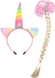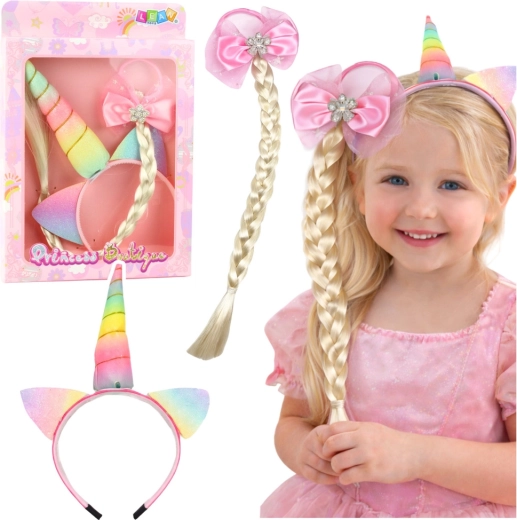 The Unicorn kids’ set is ideal for little lovers of fantasy. The headband with a horn and ears adds a fairytale look to any hairstyle, while the hair tie with a long braid and a bold pink bow creates a soft, girly accent. The materials are lightweight and pleasant to the touch, keeping the set comfortable and safe even during extended wear.