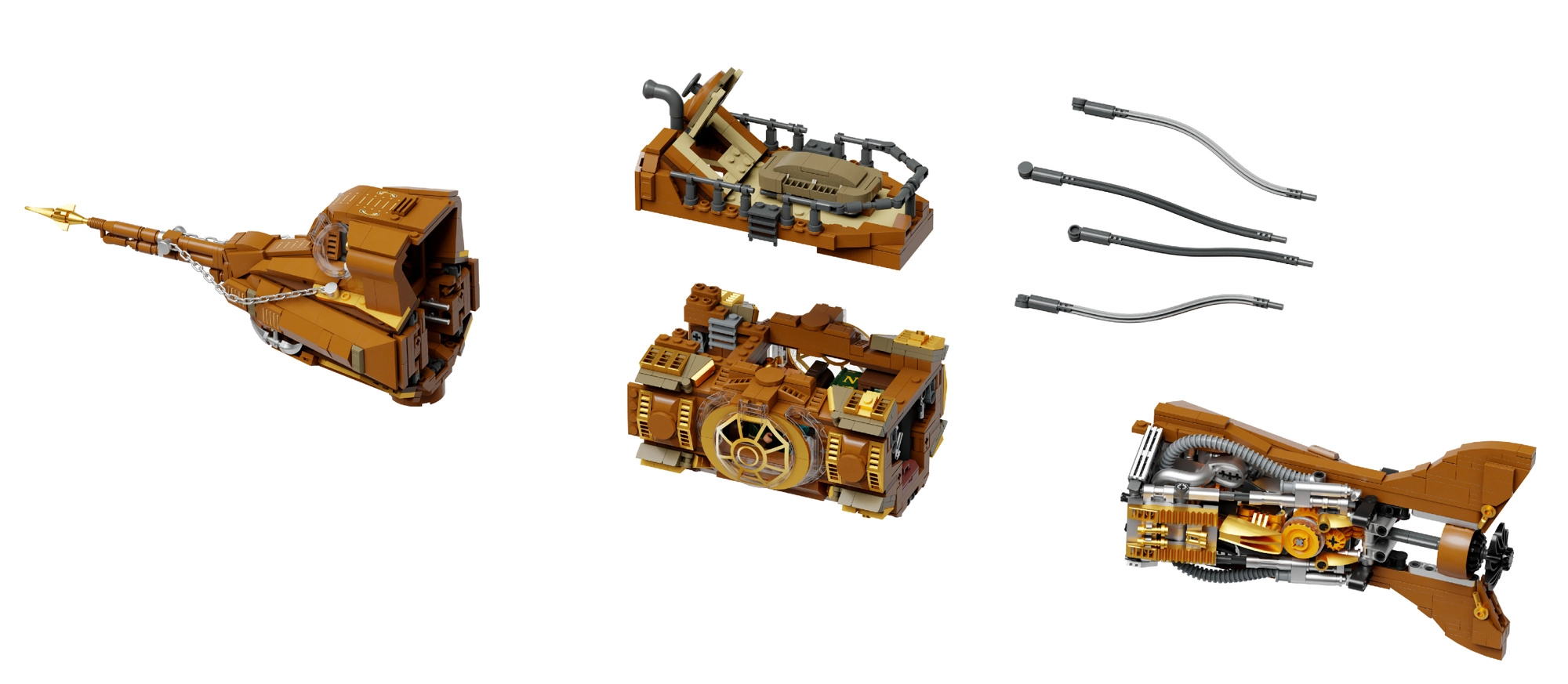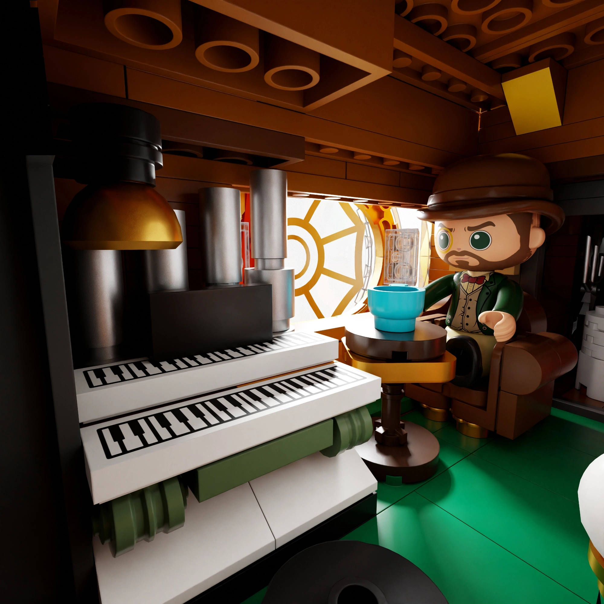 The hull is divided into a cockpit, lounge, and engine room. Easy access to the interior boosts playability and lets you explore the details of the steampunk Nautilus.